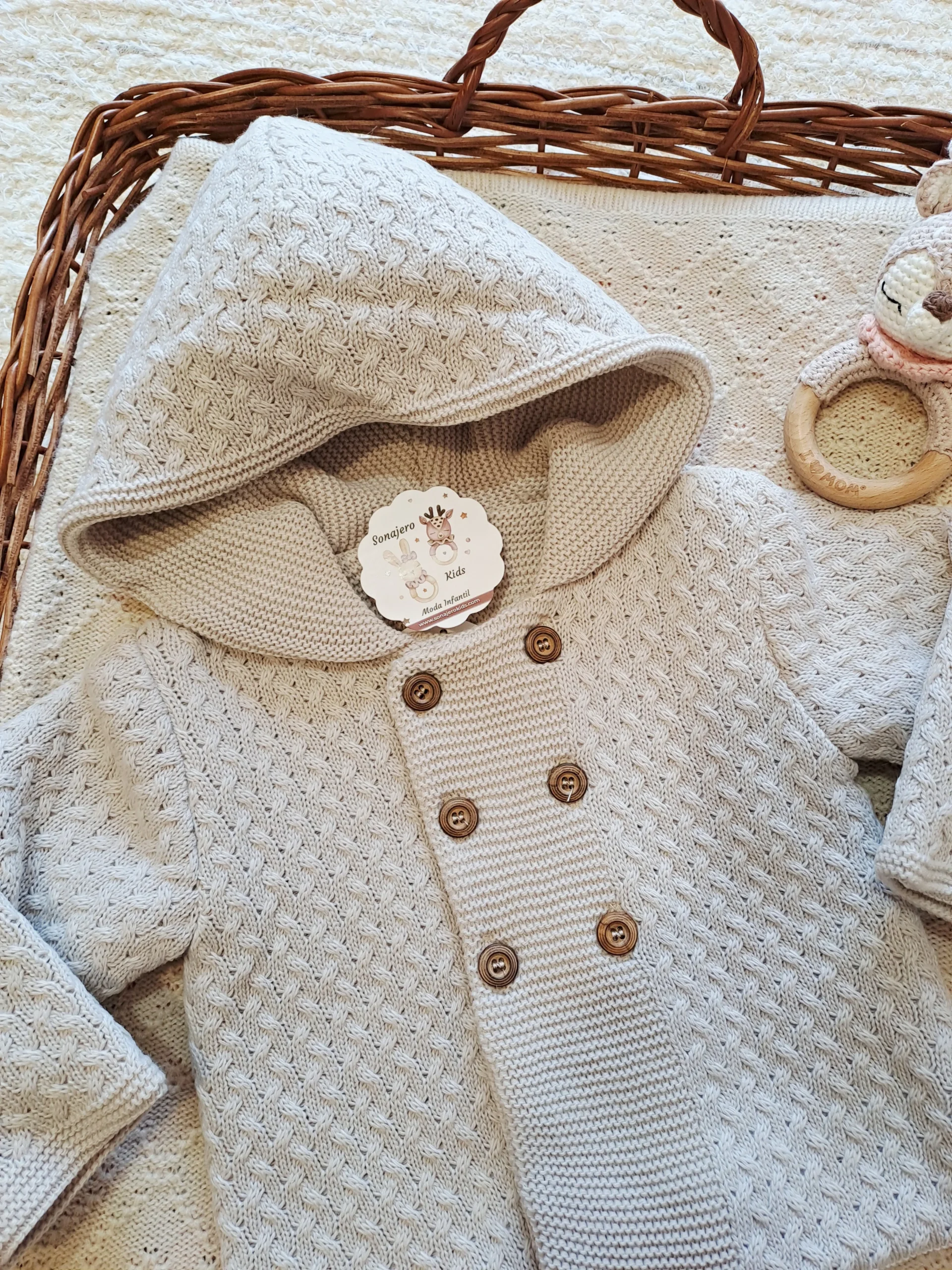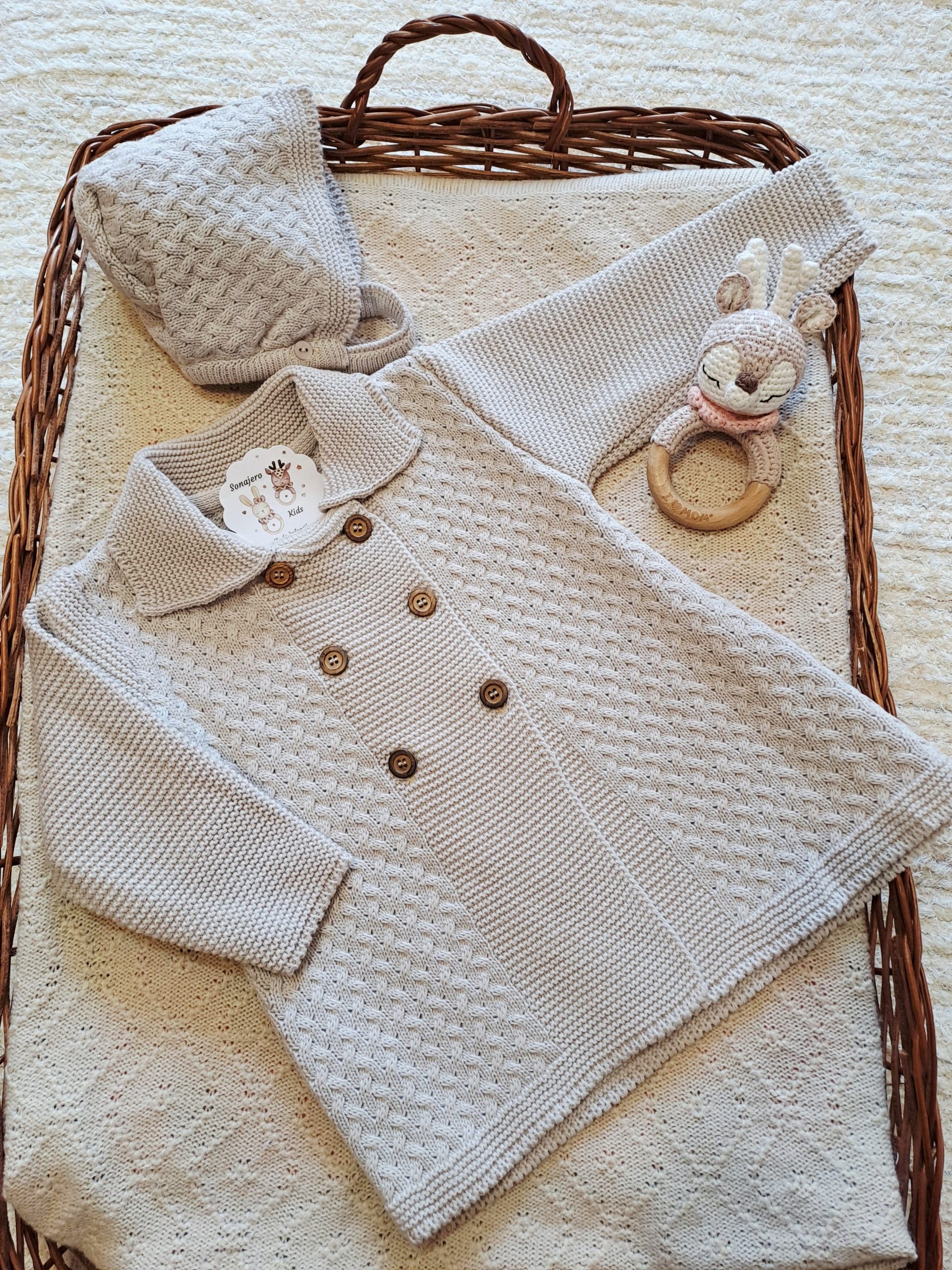 conjunto de punto para bebé en color piedra, ideal para un estilo clásico y dulce. La pieza principal es una chaqueta o rebeca de manga larga, con un diseño cruzado y cierre de doble botonadura con botones de madera de tonalidad clara. Presenta un cuello tipo solapa con lazo y un patrón de punto liso que le añade textura y detalle. El bajo de la chaqueta tiene un borde festoneado sutil.