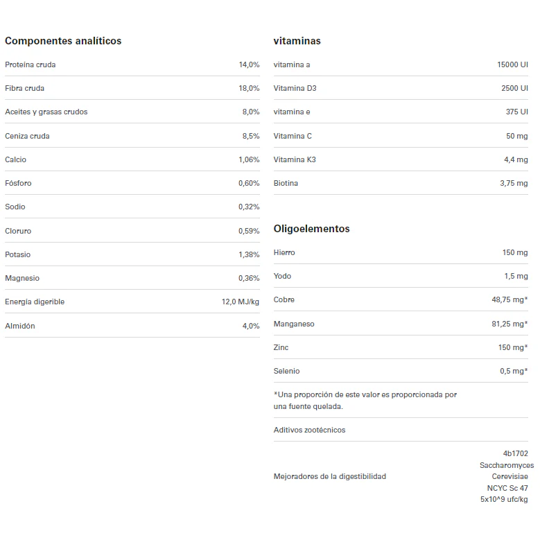 Pulpa de remolacha seca, cáscaras de soja molidas, harina de alfalfa deshidratada, soja entera extruida molida, melaza de caña, pienso de trigo, aceite de soja, harina de girasol descascarillada, fosfato monodicálcico, óxido de magnesio, sal, carbonato de calcio, levadura primaria seca, raíz de achicoria seca , Levadura seca activa, biotina.