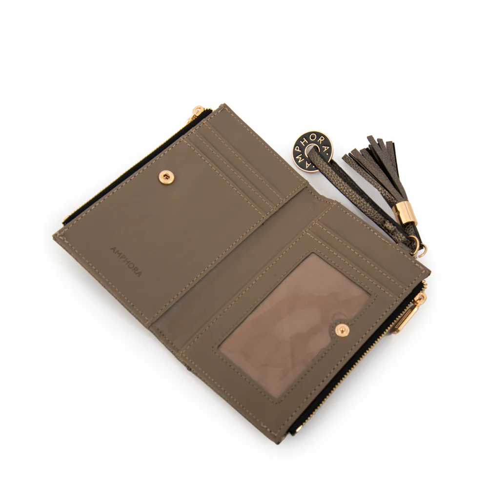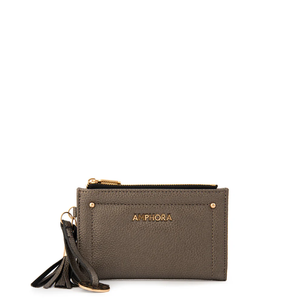 Sleek, shiny, and always on point. En plateado oscuro, la billetera Etiopía pequeña es ese detalle llamativo que suma un brillo sutil a tu día a día. Su textura en ecocuero graneado y su borla la hacen única.