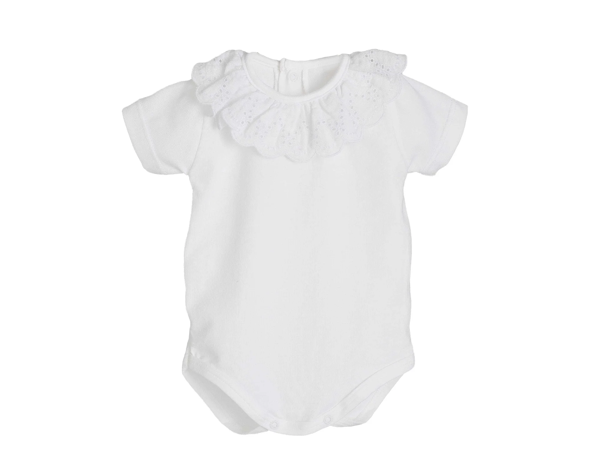 Cuello de Encaje: Destaca por un cuello volante tipo «pierrot» confeccionado en bordado suizo (broderie anglaise). El encaje presenta detalles calados florales y un borde ondeado que aporta un toque elegante y tradicional.