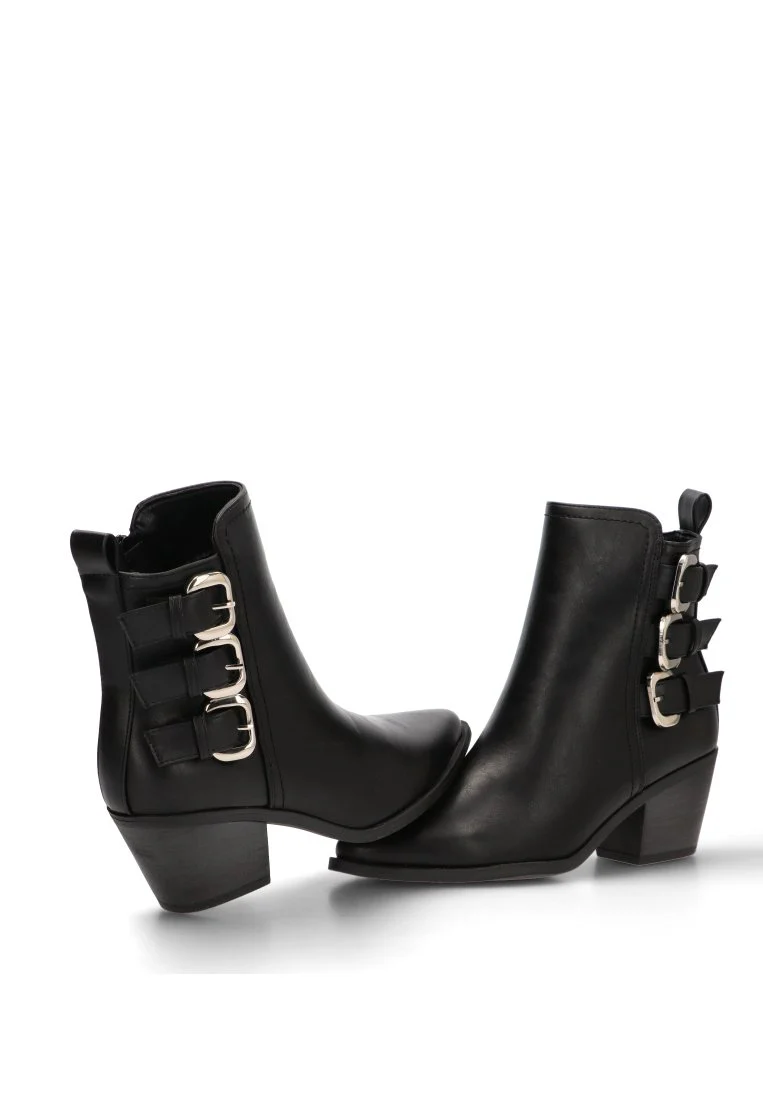 El diseño de este botín, en un clásico y atemporal color negro, destaca por sus tres hebillas decorativas que añaden un toque de audacia y modernidad. Este detalle, combinado con su estilo weekend, lo convierte en el compañero perfecto para cualquier aventura urbana. La caña de 14 cm llega justo al tobillo, estilizando la pierna y permitiendo una gran libertad de movimiento.