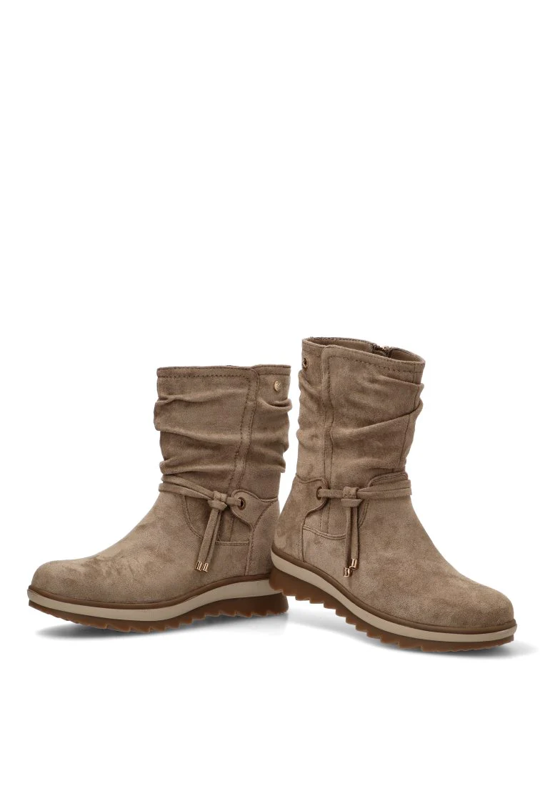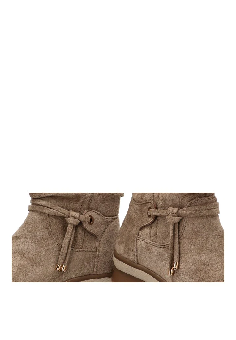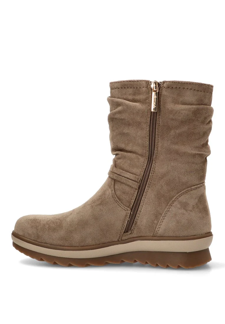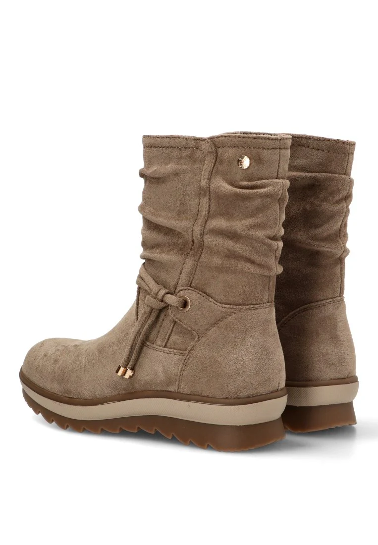 Este botÃn, con su distintivo y elegante color taupe, destaca por su originalidad. El material exterior de antelina le confiere un tacto suave y un acabado sofisticado, mientras que el efecto arrugado en la caña le da un aire relajado y bohemio. Su diseño diario se adapta perfectamente a una gran variedad de ocasiones, desde un dÃa de compras hasta una noche especial con amigos.