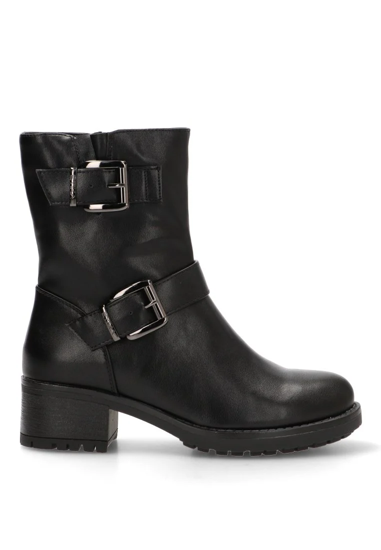 Este botín, en un clásico color negro, destaca por su imponente diseño militar con un toque biker. Su silueta robusta, combinada con una caña de 19 cm, te proporciona un look poderoso y a la moda. El tacón medio de 4,5 cm ofrece la altura ideal para estilizar la figura y a la vez garantiza una gran estabilidad y comodidad durante todo el día.