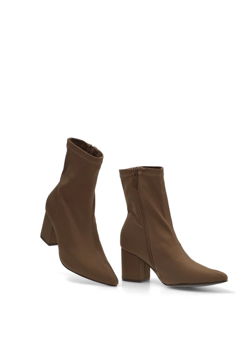 Este botÃn, en un atemporal y versátil color taupe, destaca por su material exterior de lycra, que se ajusta perfectamente a la forma de tu pierna. Su diseño weekend es ideal para cualquier ocasión, desde una salida con amigas hasta un evento más formal. La silueta esbelta y la caña de 21 cm, que se adapta como un calcetÃn, estilizan la figura y aportan un toque de modernidad.