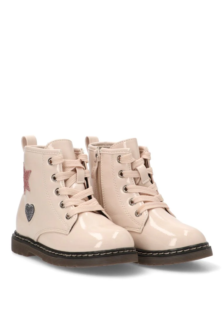 Este botÃn, en un elegante y atemporal color beige, destaca por su originalidad. Su diseño militar le da un aspecto audaz y robusto, ideal para las exploradoras más intrépidas. Pero, al mismo tiempo, los sutiles y encantadores detalles de estrellas y corazones le añaden un toque de fantasÃa y magia. Los cordones no solo son un elemento de diseño, sino que también permiten un ajuste perfecto y seguro, ideal para las pequeñas que no paran de moverse.