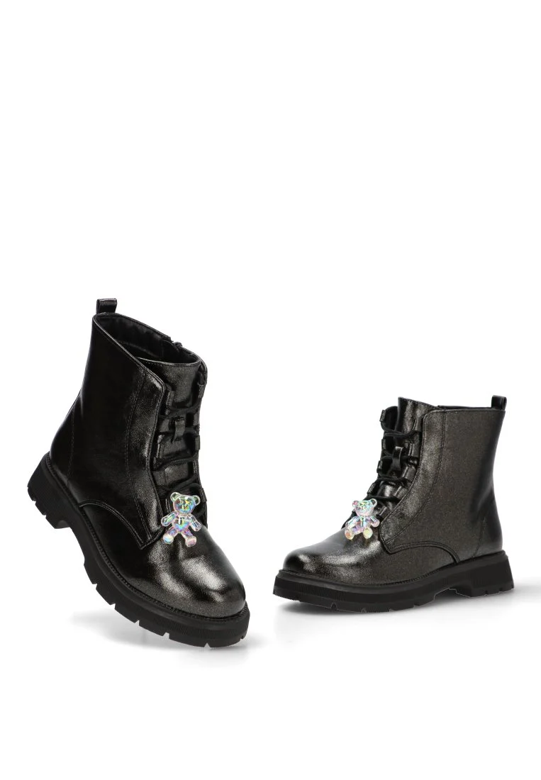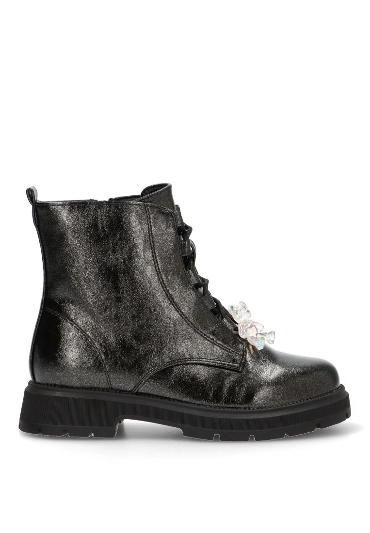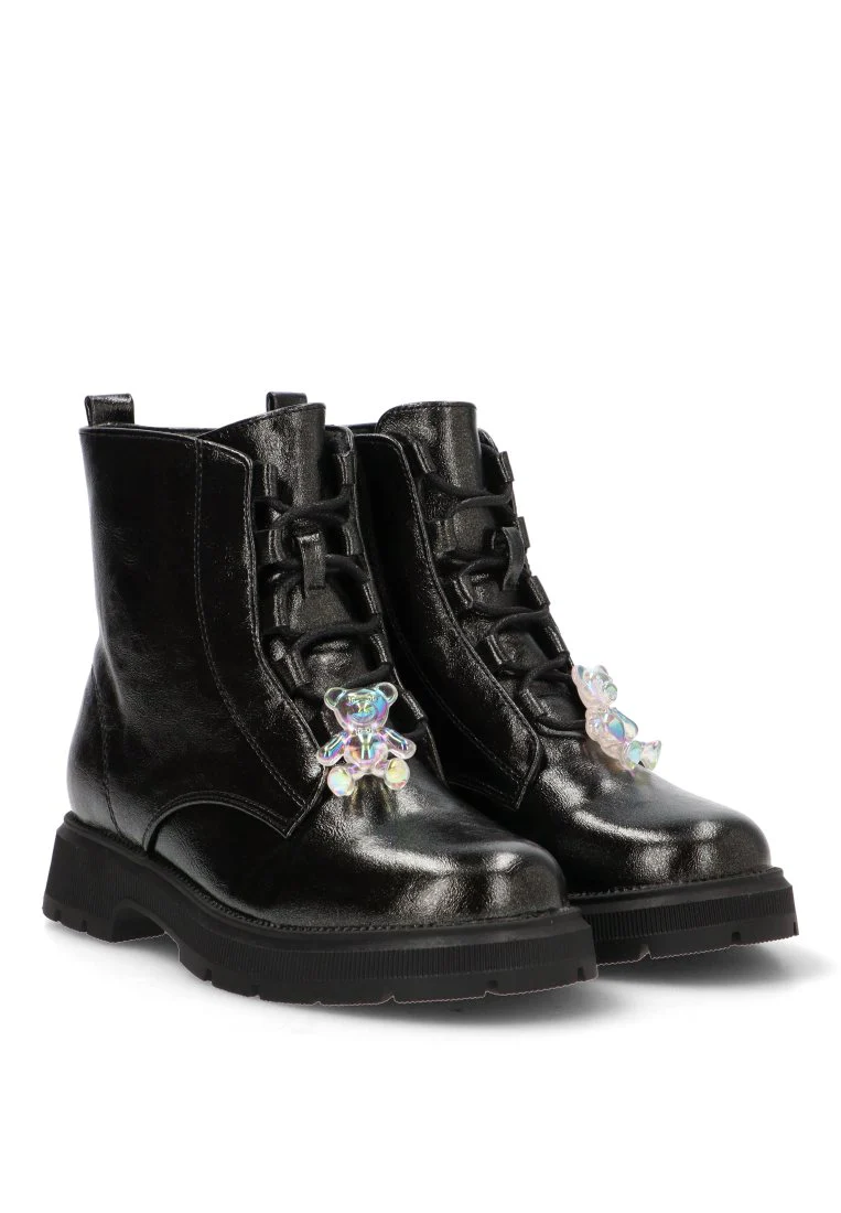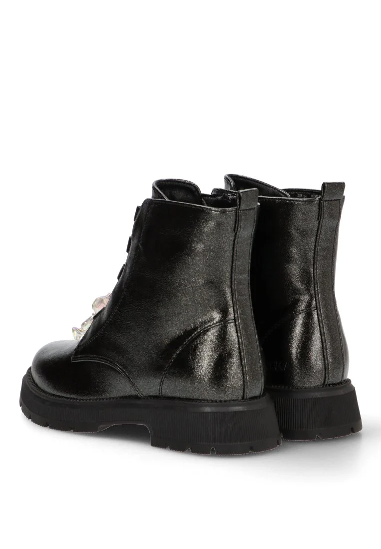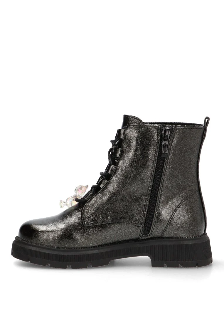 Este botín, con su atemporal color negro, aporta un toque de fuerza a cualquier look. Su diseño militar es ideal para las niñas que aman los estilos modernos y con personalidad. Los cordones no solo son un detalle estético que evoca el calzado de aventura, sino que también permiten un ajuste perfecto al pie, asegurando que cada paso sea firme y seguro. La caña de 12,5 cm ofrece el soporte ideal para el tobillo, mientras su silueta se adapta a la perfección a los pies de las más jóvenes.
