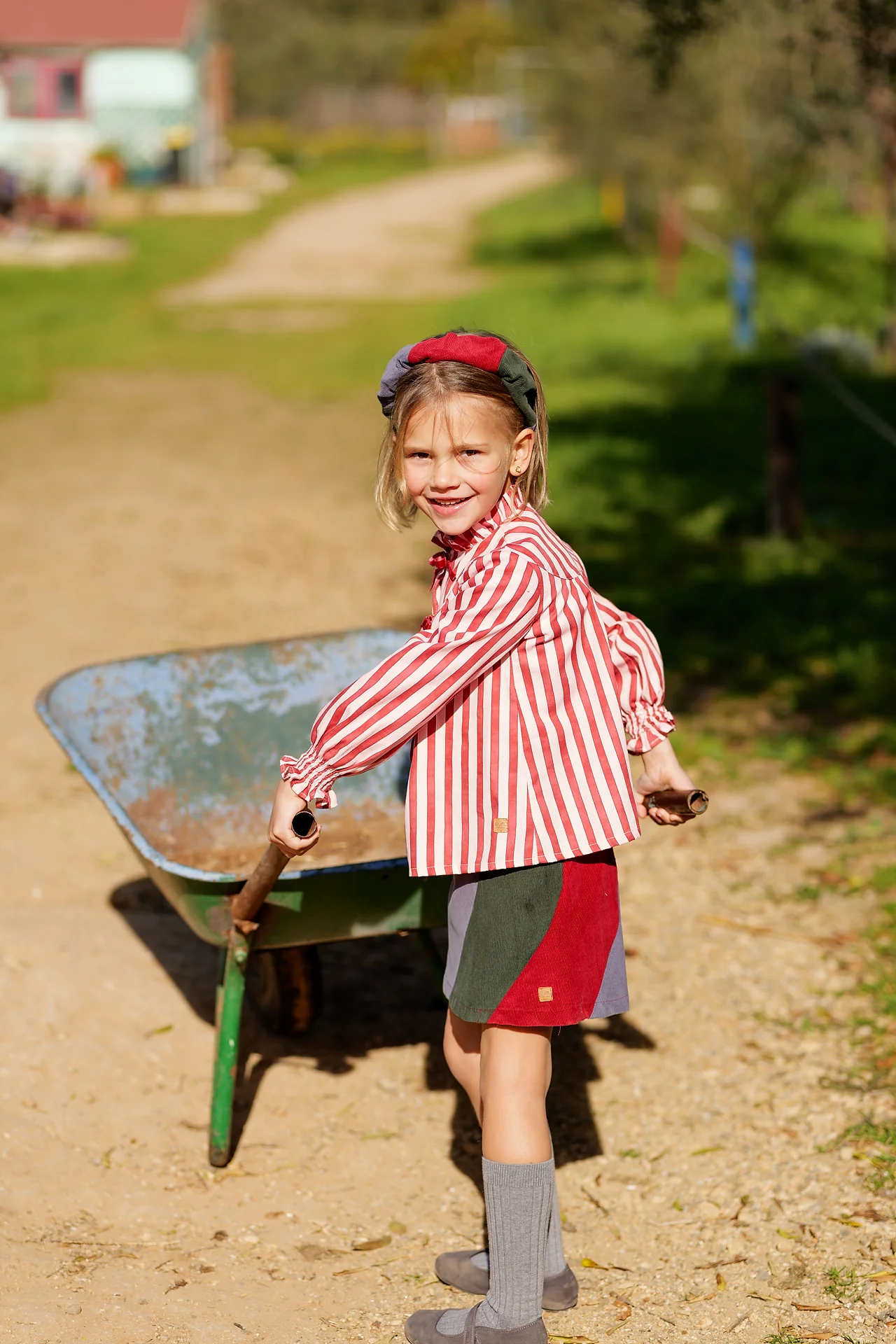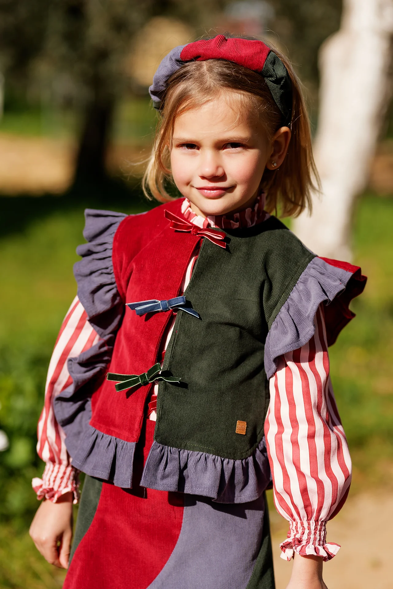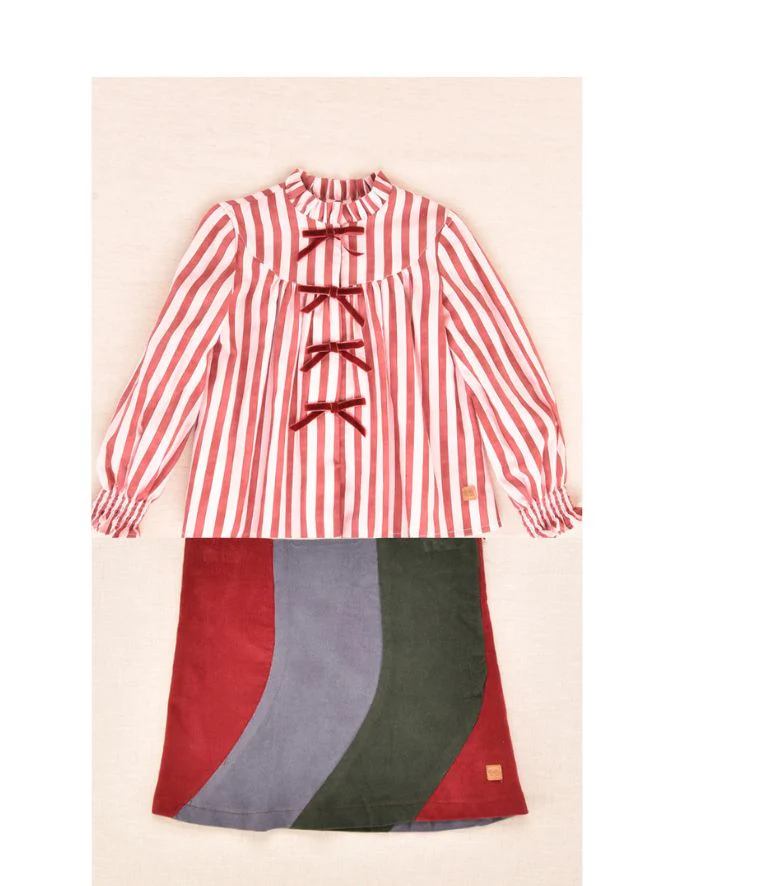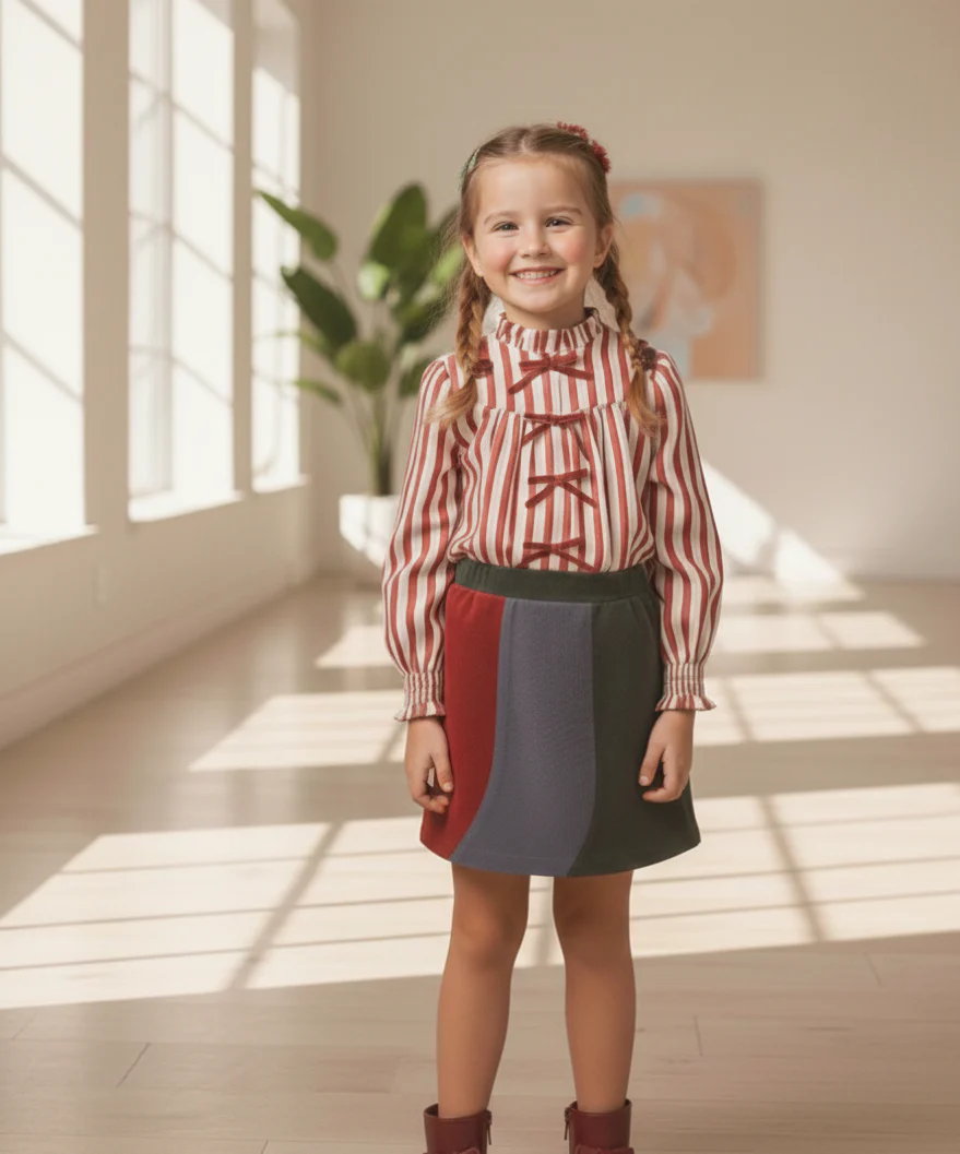 Conjunto falda de terciopelo haciendo ondas y camisa de rayas con lazos rojos delanteros de terciopelo
