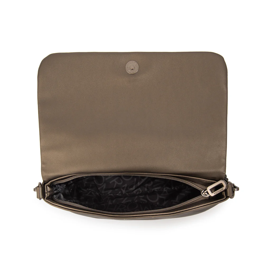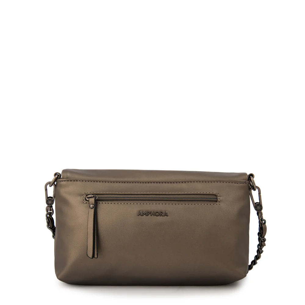 Wake up your boho-chic side. la cartera bandolera con tapa #Huber está hecha para ti, confeccionada en cuero vegano plateado oscuro con un efecto metalizado envejecido y diseño étnico casual que te permite expresarte. Sus múltiples bolsillos (1 exterior y 3 interiores) te ayudan a mantener tus esenciales organizados, mientras que la correa ajustable y el cierre con botón imantado añaden comodidad y seguridad. Si buscas una bandolera de mujer que combine con todo, #Huber es tu elección.