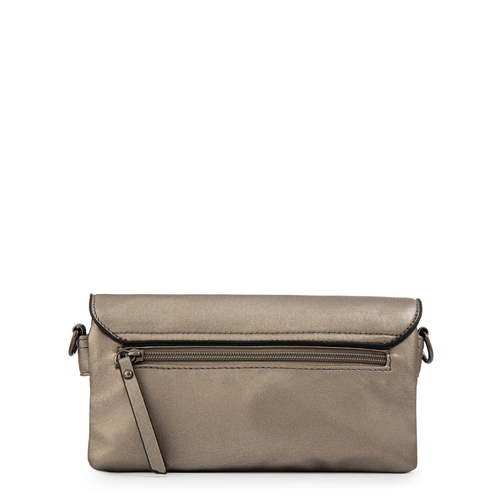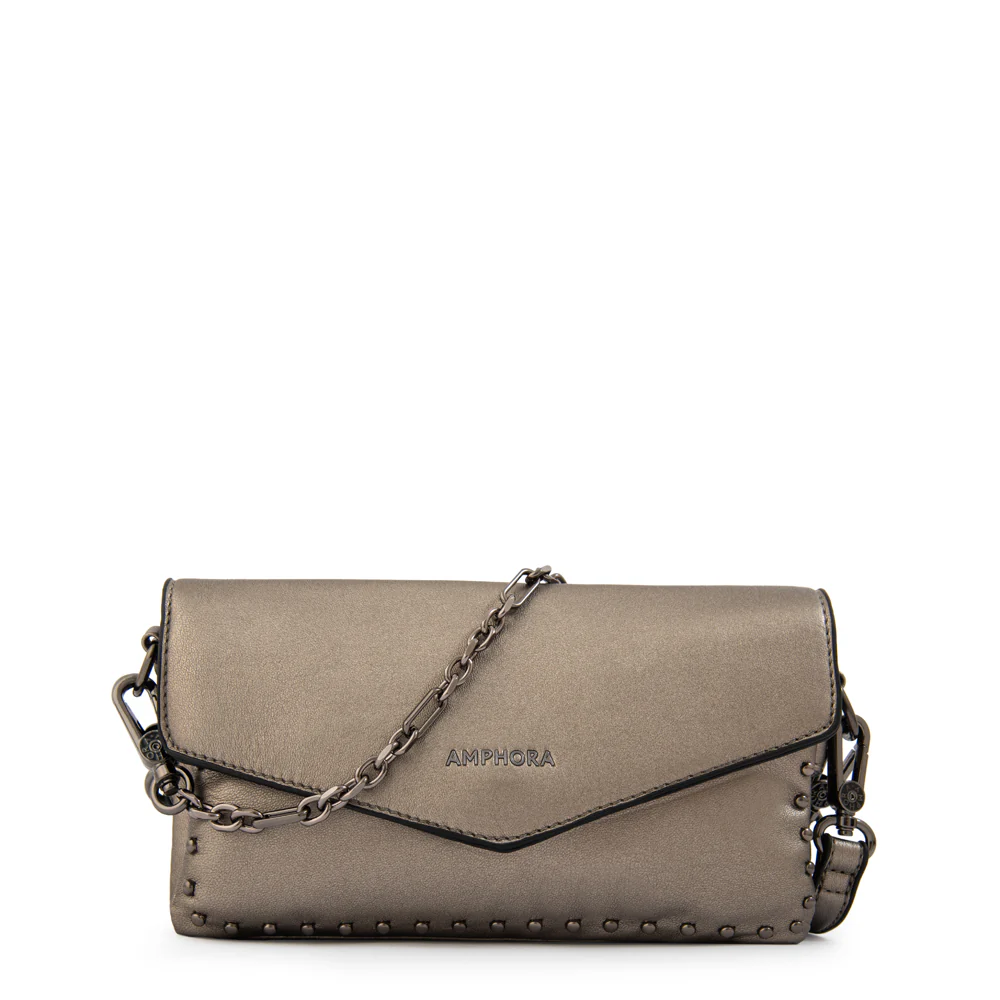 La bandolera Jani de Amphora es puro glamour urbano. Su mezcla de texturas, solapa en negro y cadena metálica crean un bolso statement que no pasará desapercibido.
