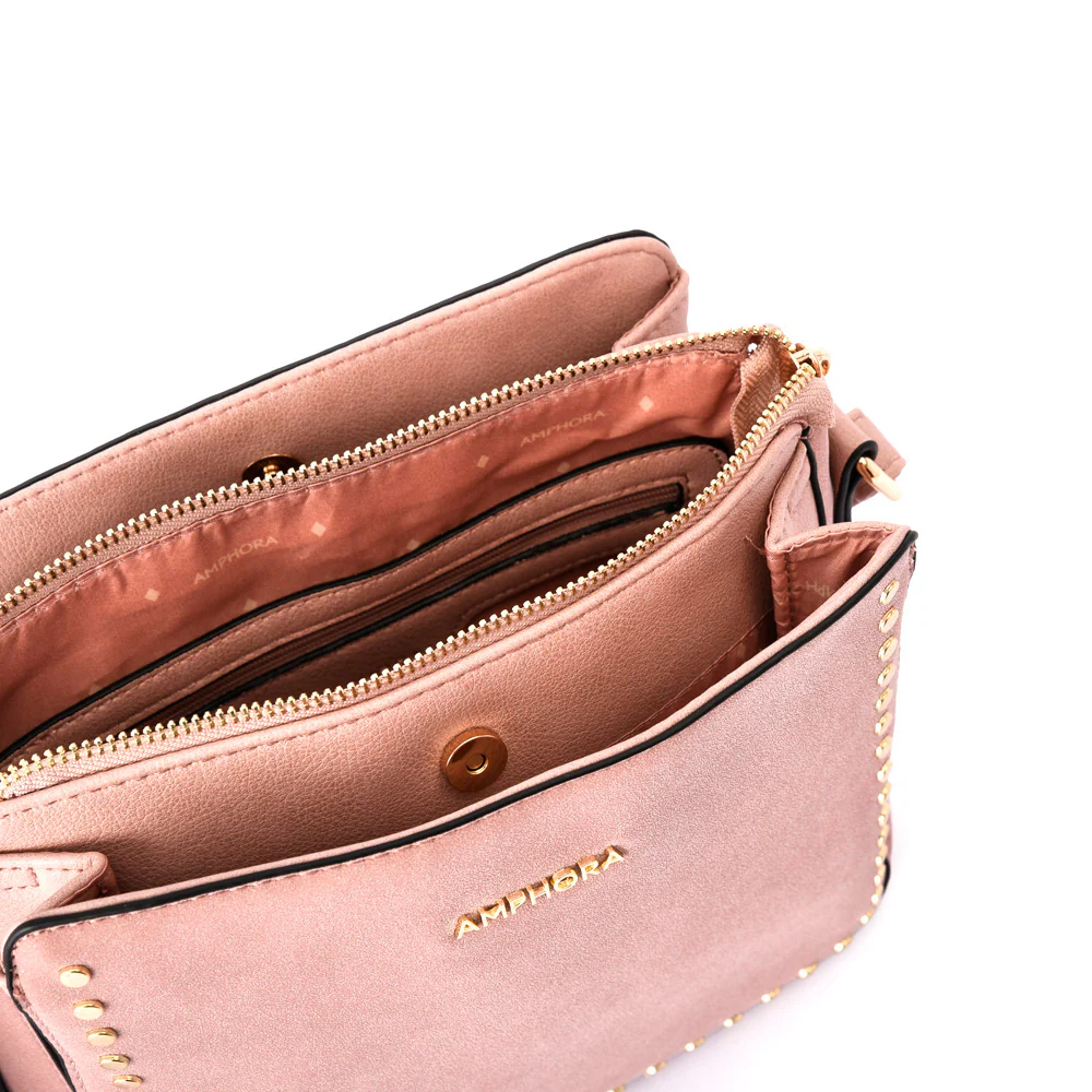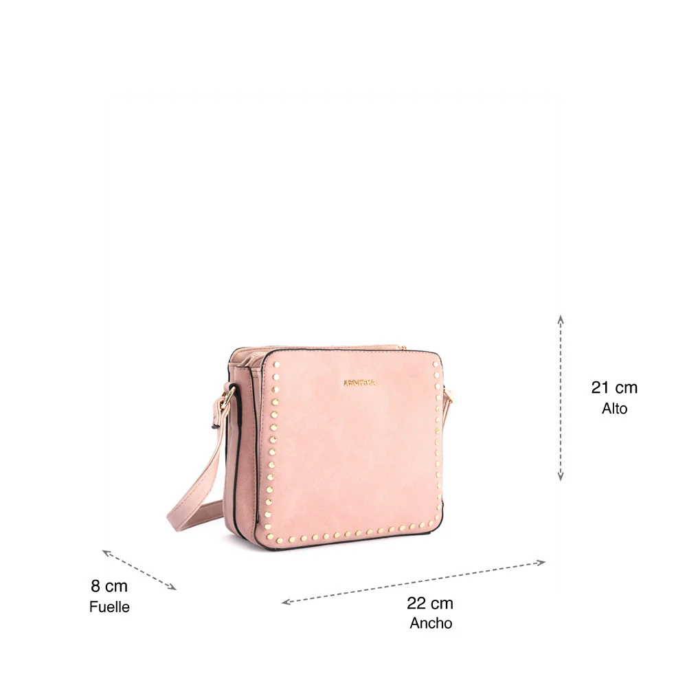 Everyday bag, Amnia es esa cartera bandolera tres divisiones que quieres tener. Su tamaño es grande y además su correa que se adapta al largo que quieras para llevarla al hombro o cruzada. Tiene un diseño y detalles de tachas que la hacen clásica con un toque moderno. I choose Amnia.