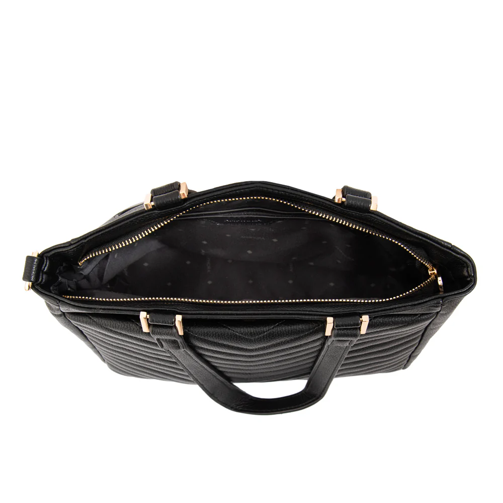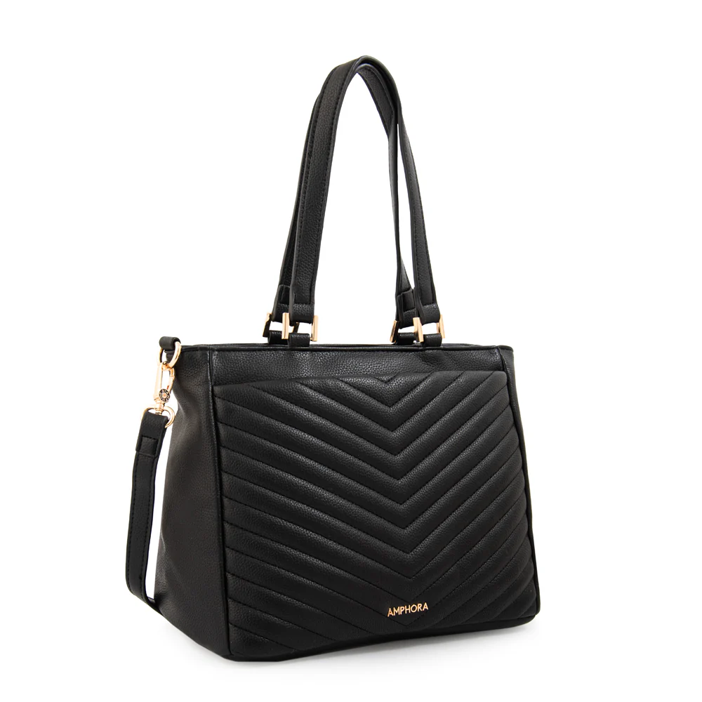 La Cartera Filomena de Amphora con dos asas está confeccionada en PU acolchado con costuras en patrón chevron. De tamaño grande, incluye compartimentos internos para mantener todo organizado y un strap adicional ajustable para mayor comodidad. Es el bolso perfecto para quienes buscan una cartera amplia, funcional y elegante.