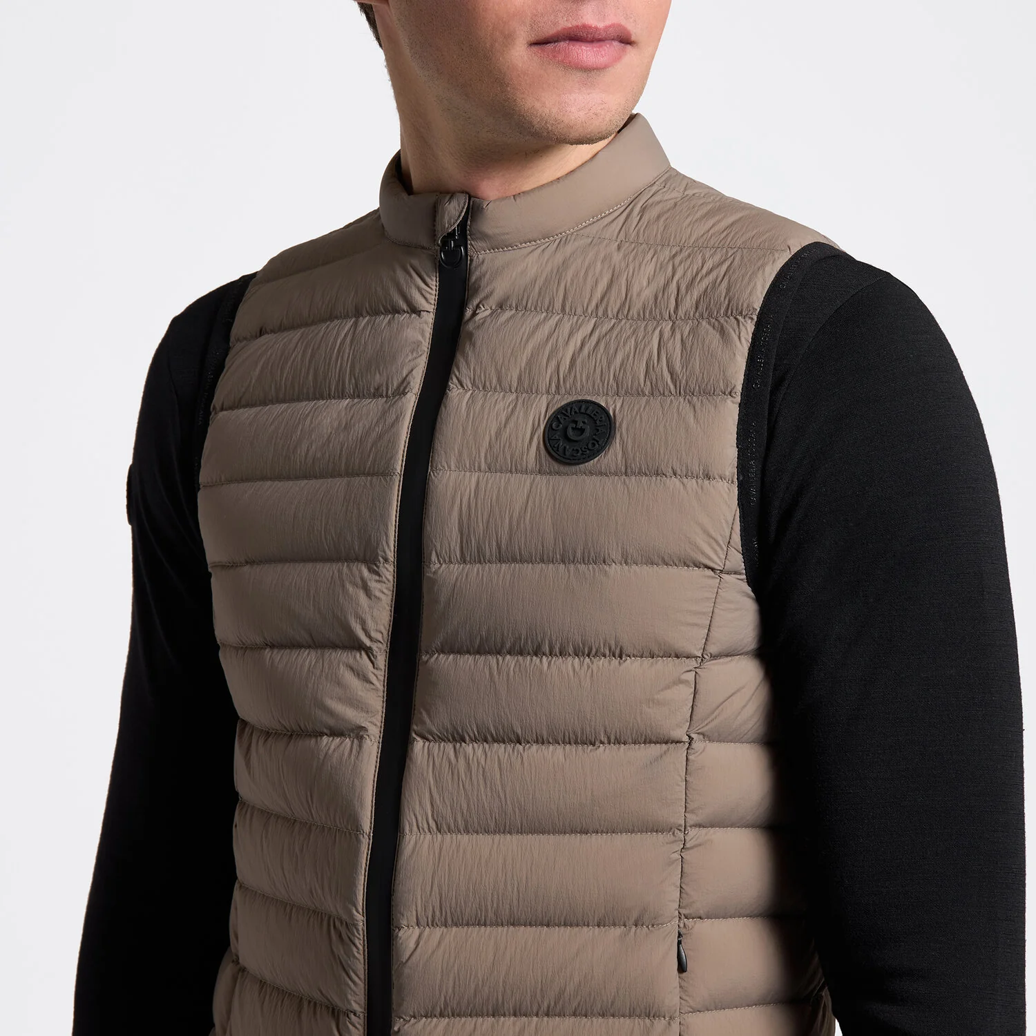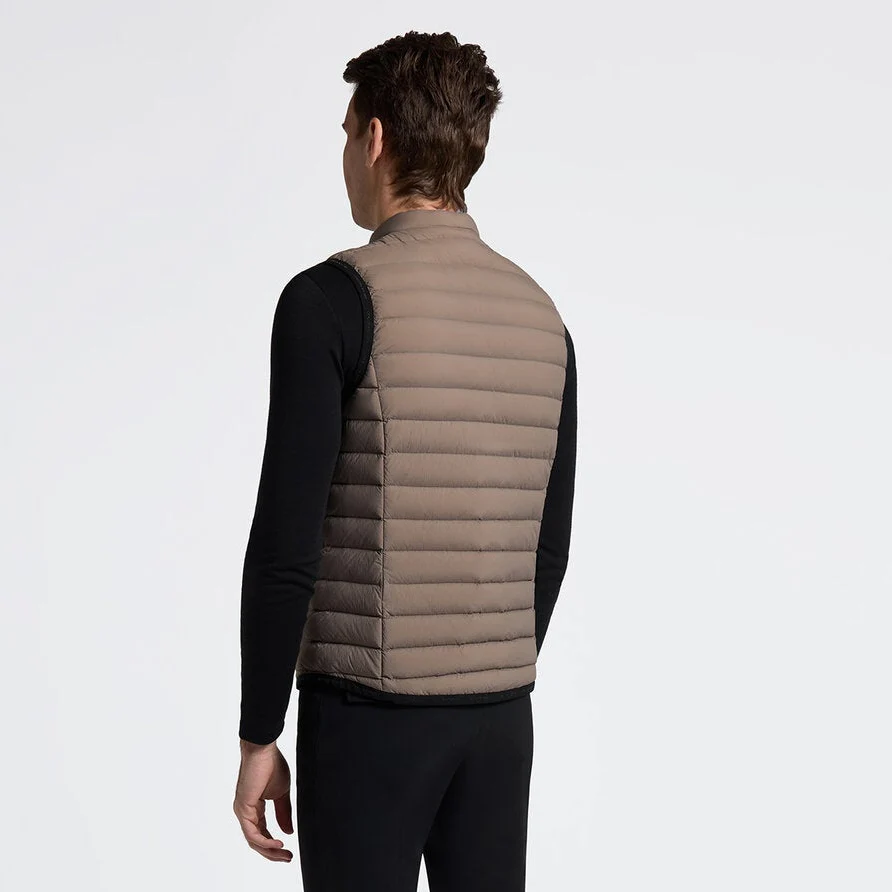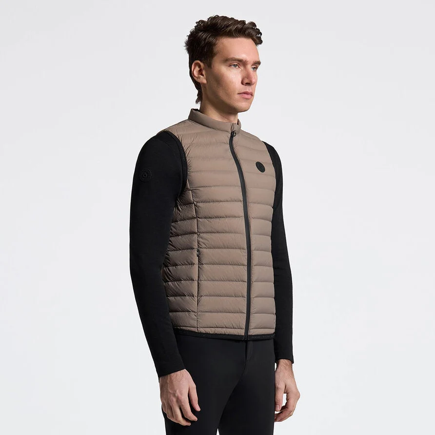 • Fabricado en nailon ligero y duradero, cuenta con relleno de plumón natural para mayor aislamiento térmico y comodidad. Su ajuste ergonómico incluye una cremallera central y bolsillos invisibles, mientras que los ribetes elásticos en las sisas y el bajo garantizan una silueta ceñida.