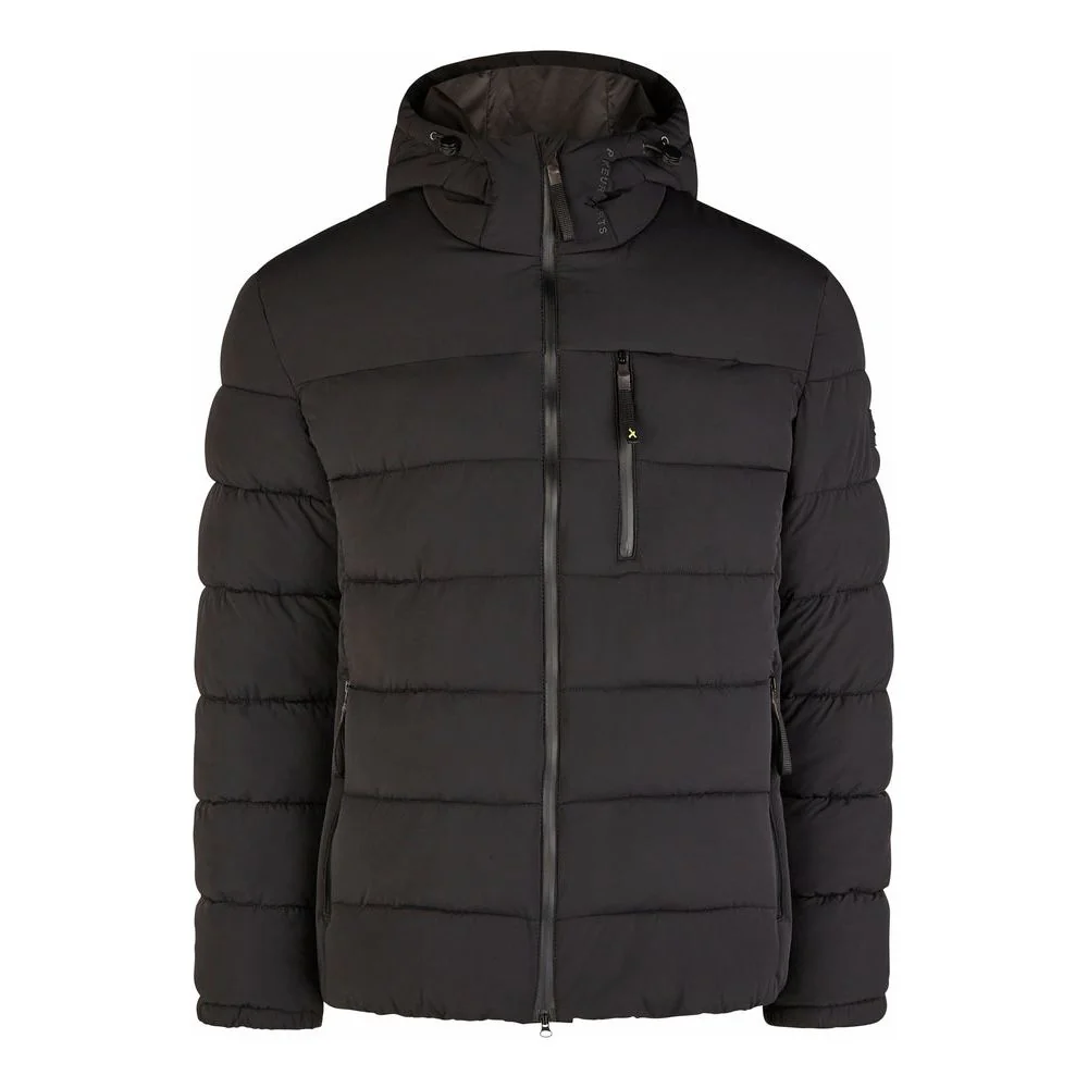 - Chamarra acolchada elástica con capucha fija.
