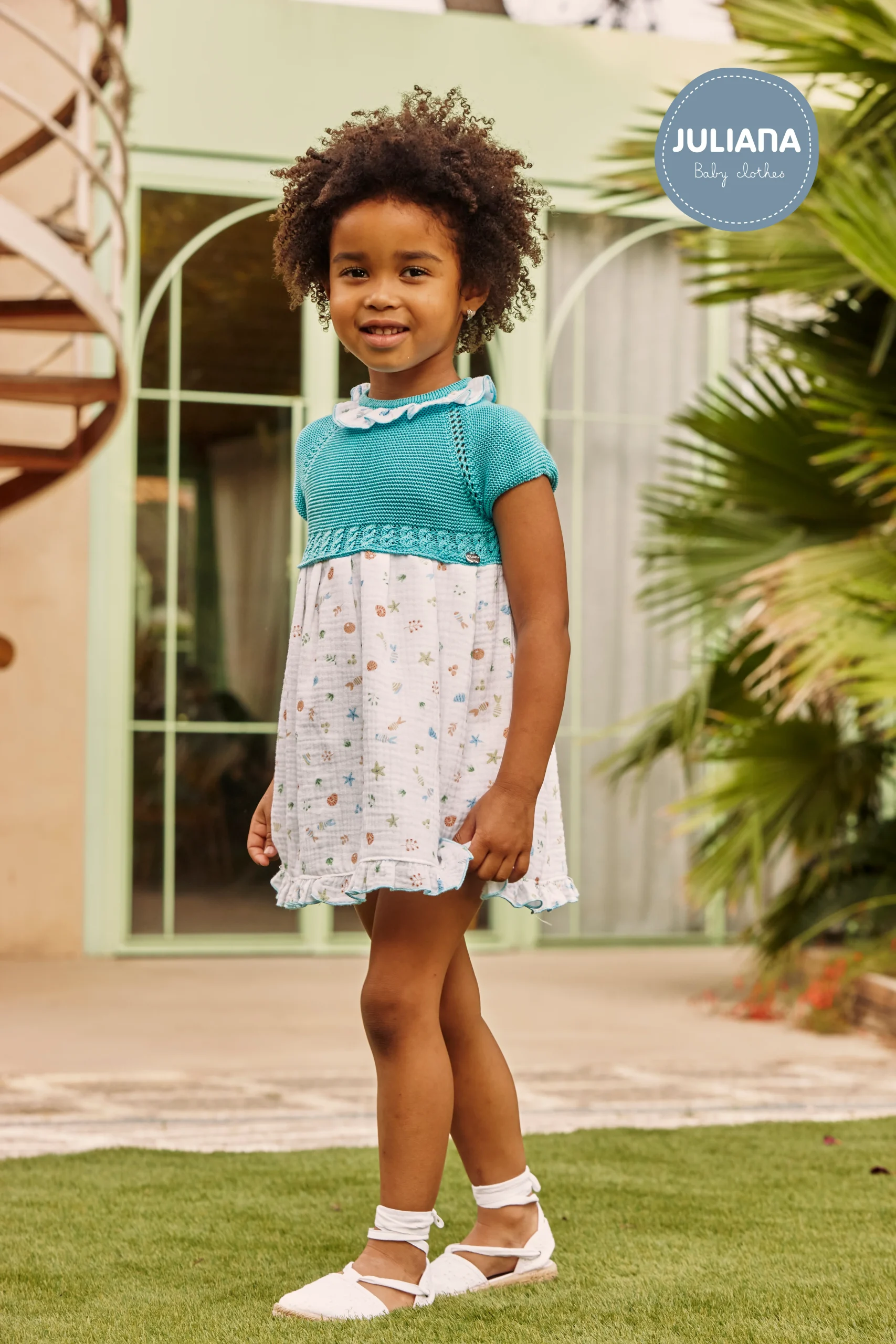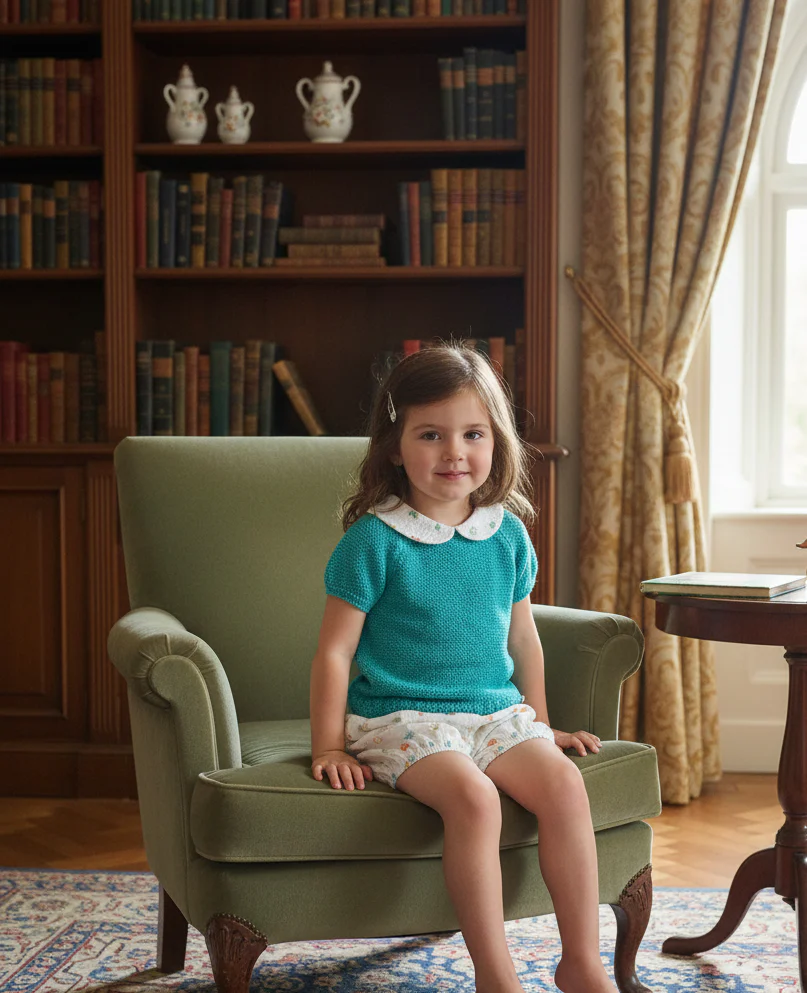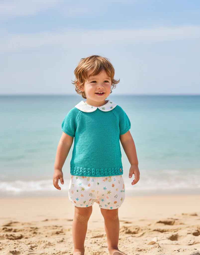 Conjunto de Punto Artesanal en Turquesa y Flores Este encantador conjunto de dos piezas combina la textura acogedora de un jersey de punto turquesa con la delicadeza de una braguita estampada en flores. El cuello «Peter Pan» bordado añade un toque de elegancia clásica, ideal para ocasiones especiales o paseos con estilo.