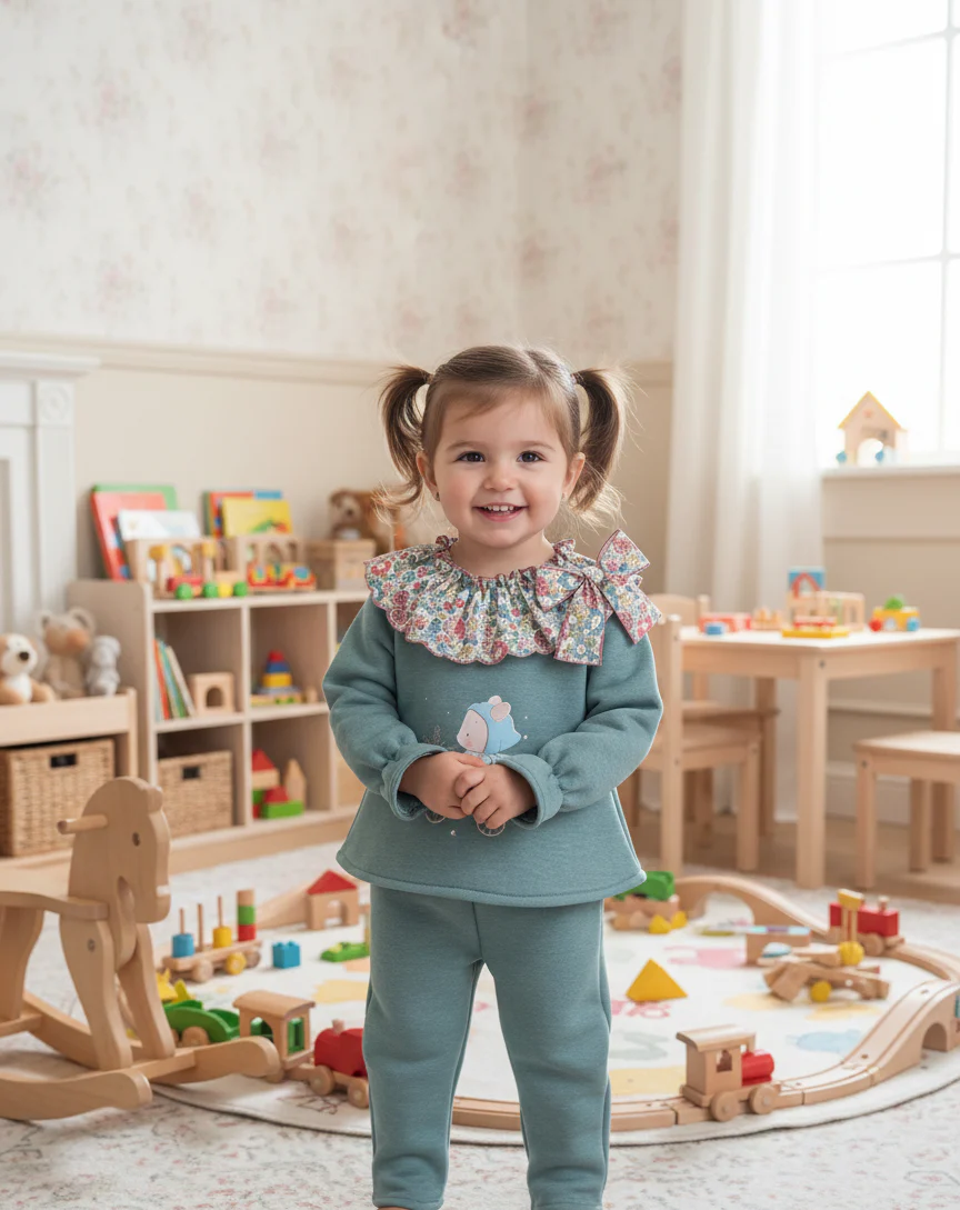 El conjunto infantil de sudadera, camiseta y pantalón 3 piezas de algodón color verde empolvado con un diseño clásico con estampado de oso en bici y volante en el cuerpo con lazo la camiseta blanca con remate en rosa en el filo del volante, confeccionado en un material suave y cálido.