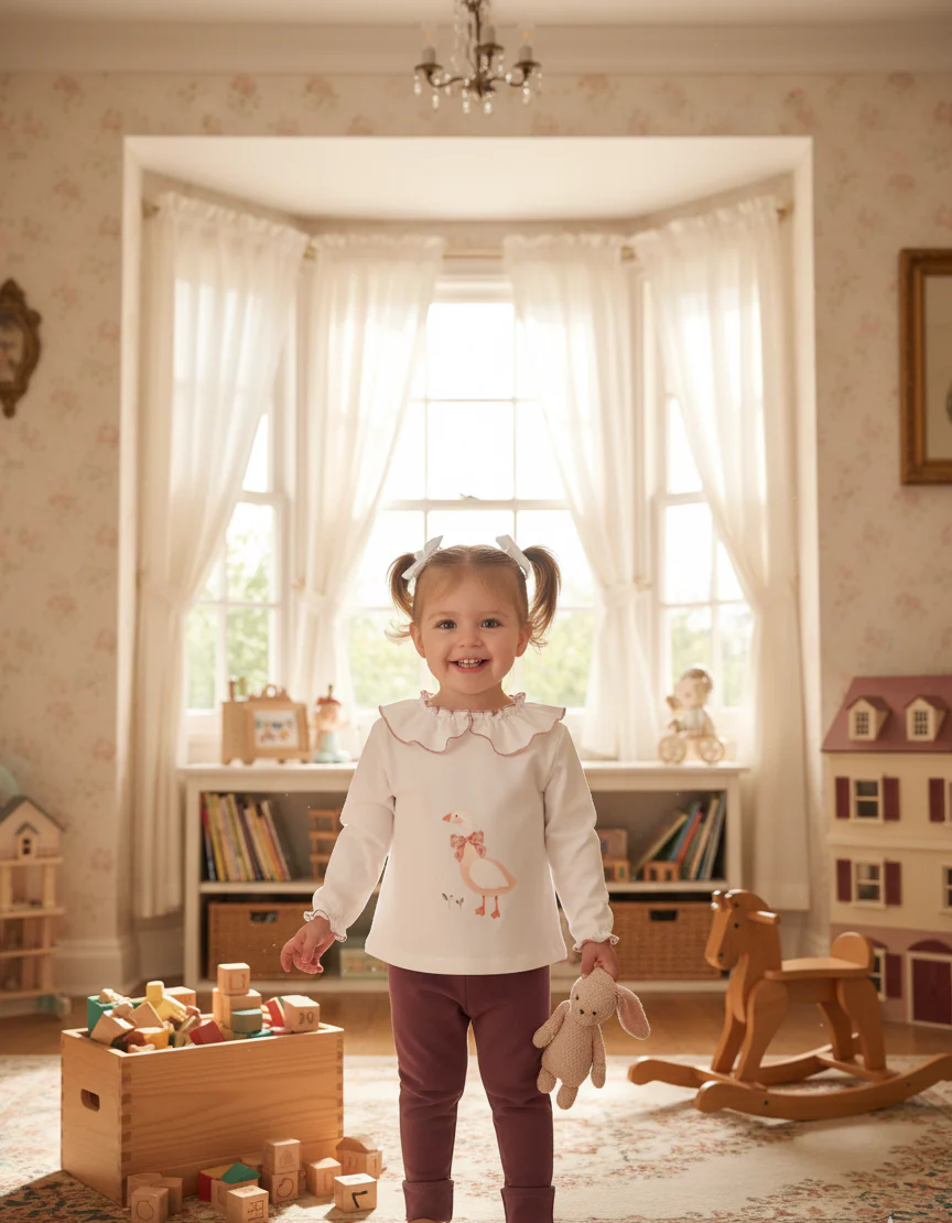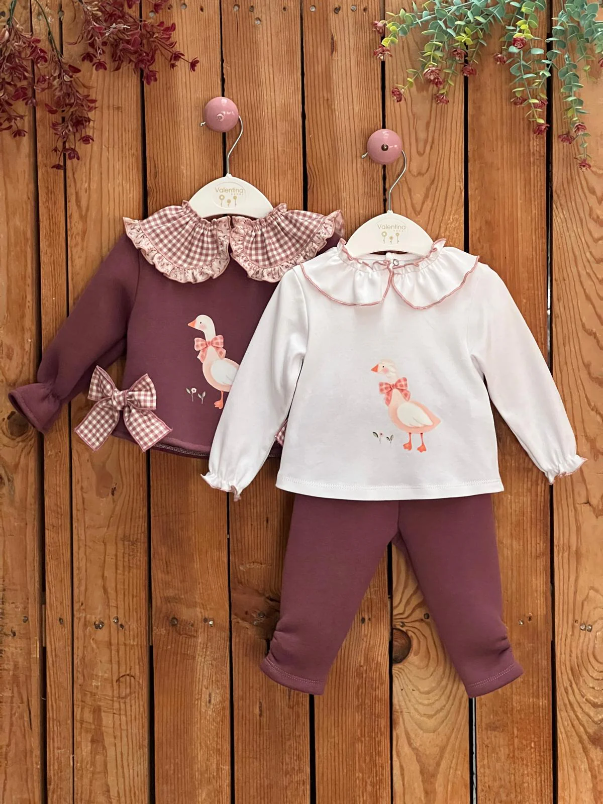 El conjunto infantil de sudadera, camiseta y pantalón 3 piezas de algodón color bugambilla con un diseño clásico con estampado de un oca y volante en el cuerpo con lazo , confeccionado en un material suave y cálido.