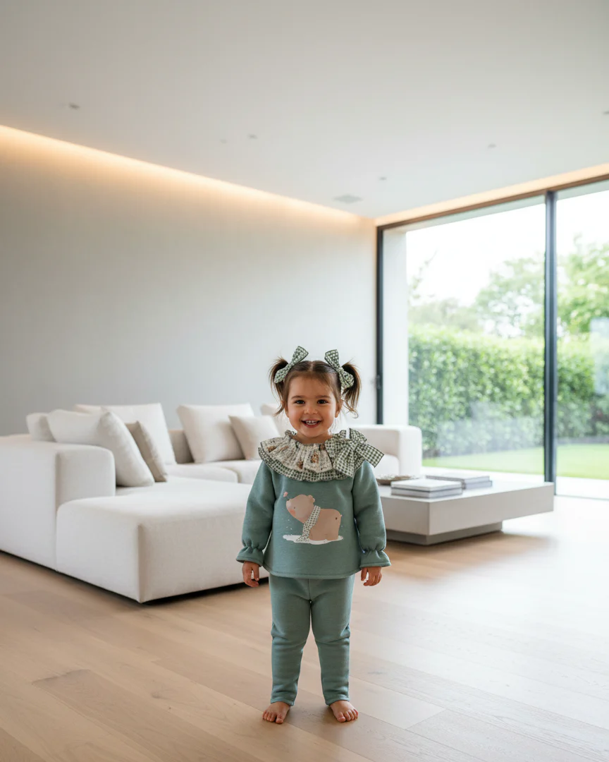 El conjunto infantil de sudadera, camiseta y pantalón 3 piezas de algodón color verde empolavado con un diseño clásico con estampado de oso y volante en el cuerpo con lazo la camiseta blanca con remate en rosa en el filo del volante, confeccionado en un material suave y cálido.