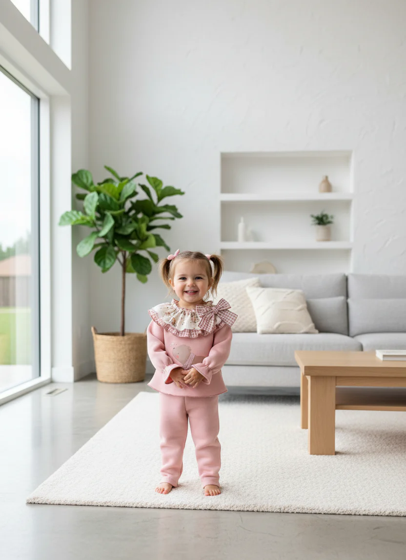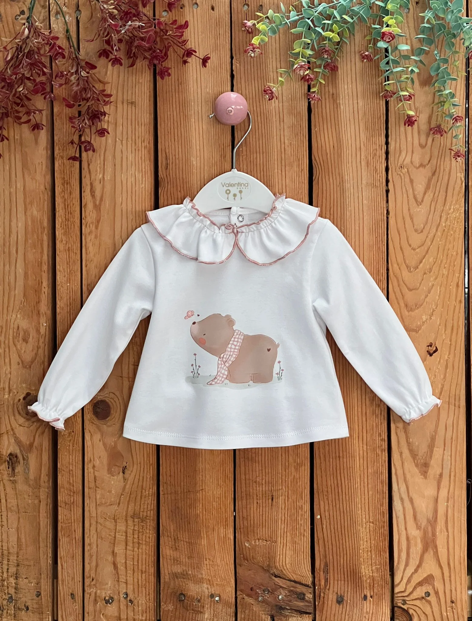 El conjunto infantil de sudadera, camiseta y pantalón 3 piezas de algodón color rosa con un diseño clásico con estampado de oso y volante en el cuerpo con lazo la camiseta blanca con remate en rosa en el filo del volante, confeccionado en un material suave y cálido.