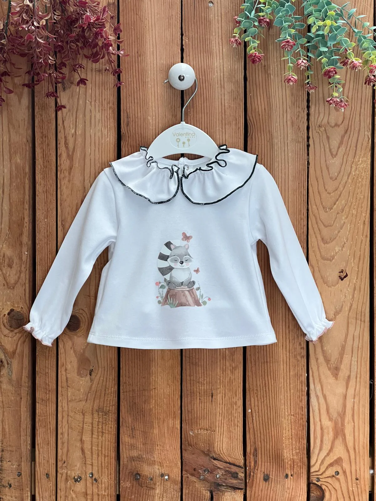 El conjunto infantil de sudadera, camiseta y pantalón 3 piezas de algodón color verde palido con un diseño clásico con estampado de un mapache y volante en el cuerpo con lazo , confeccionado en un material suave y cálido.