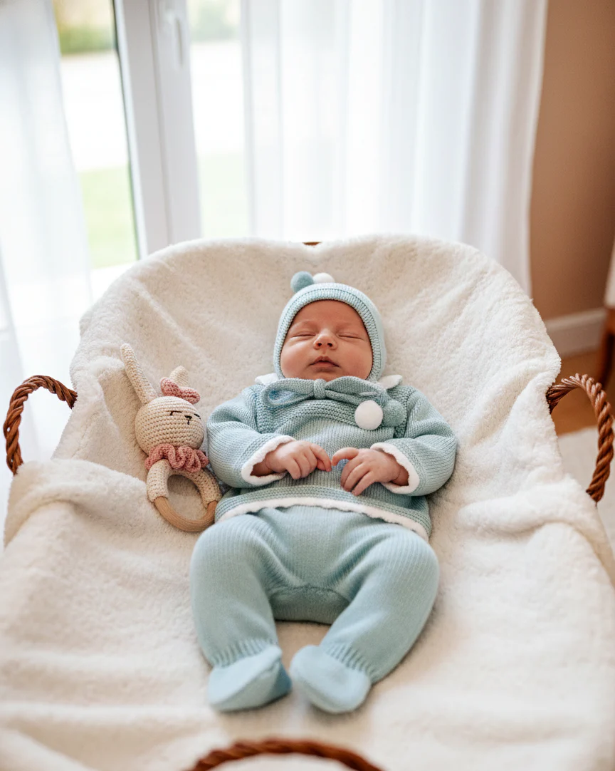 El conjunto infantil incluye un suéter de color verde pálido con un diseño clásico con dos pompones y rematado en blanco, confeccionado en un material suave y cálido. Tiene botones traseros para facilitar su colocación. Se combina con un polainas del mismo color bien diseñado para comodidad. Lo que le da un toque natural y acogedor.