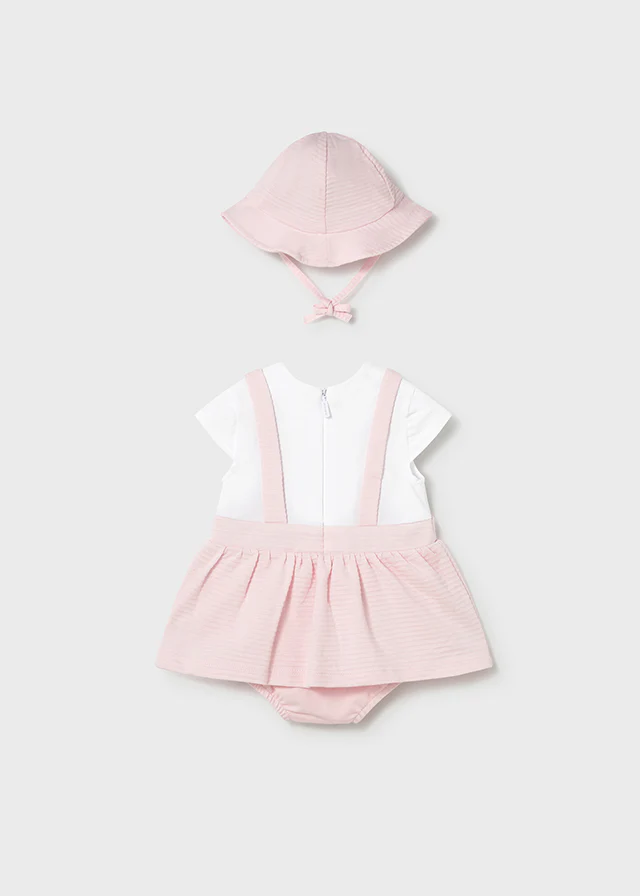 Sombrero (Bucket Hat): Incluye un gorrito a juego, fabricado con el mismo tejido rosa texturizado que el peto, perfecto para proteger del sol con estilo.
