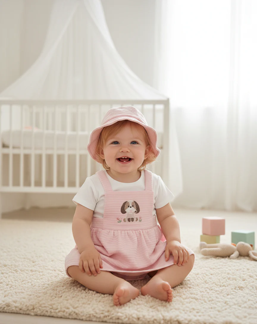 Peto/Vestido: Es la pieza central en color rosa suave con una textura de micro-pana o punto labrado en relieve. Destaca por un bordado central de un perrito marrón con detalles de flores pequeñas a los lados, lo que le da un toque tierno y artesanal.