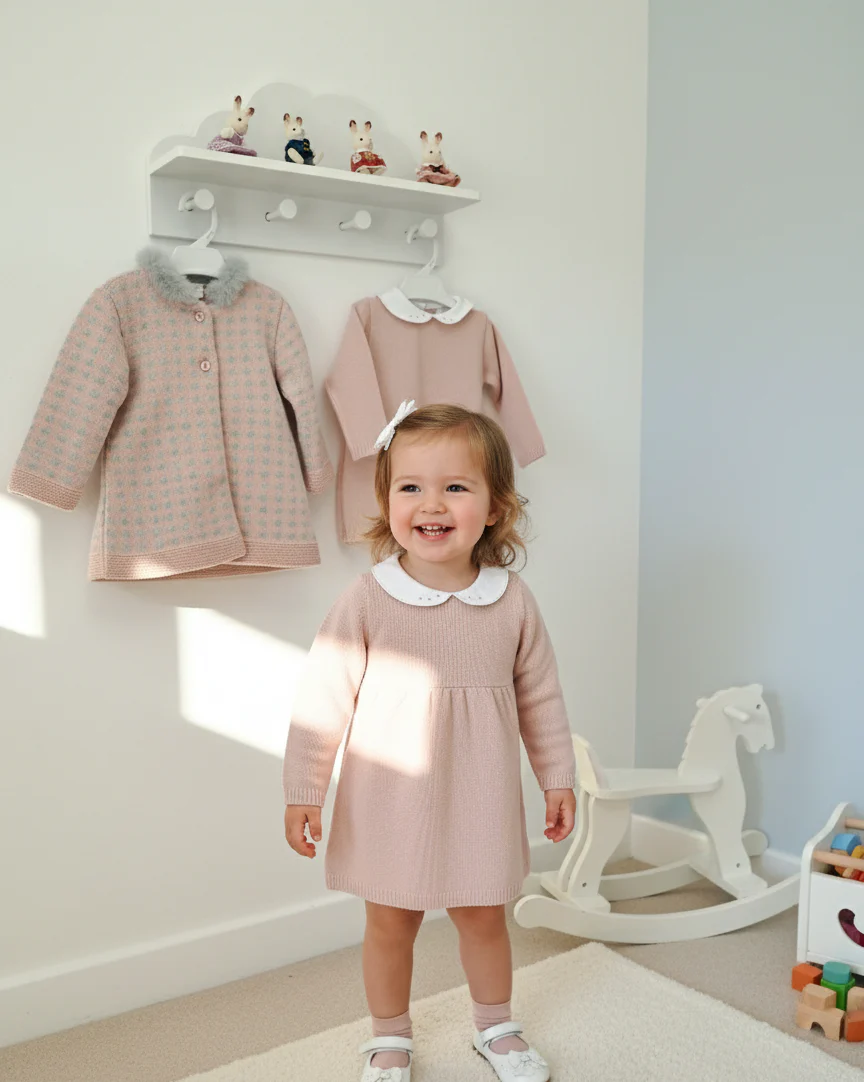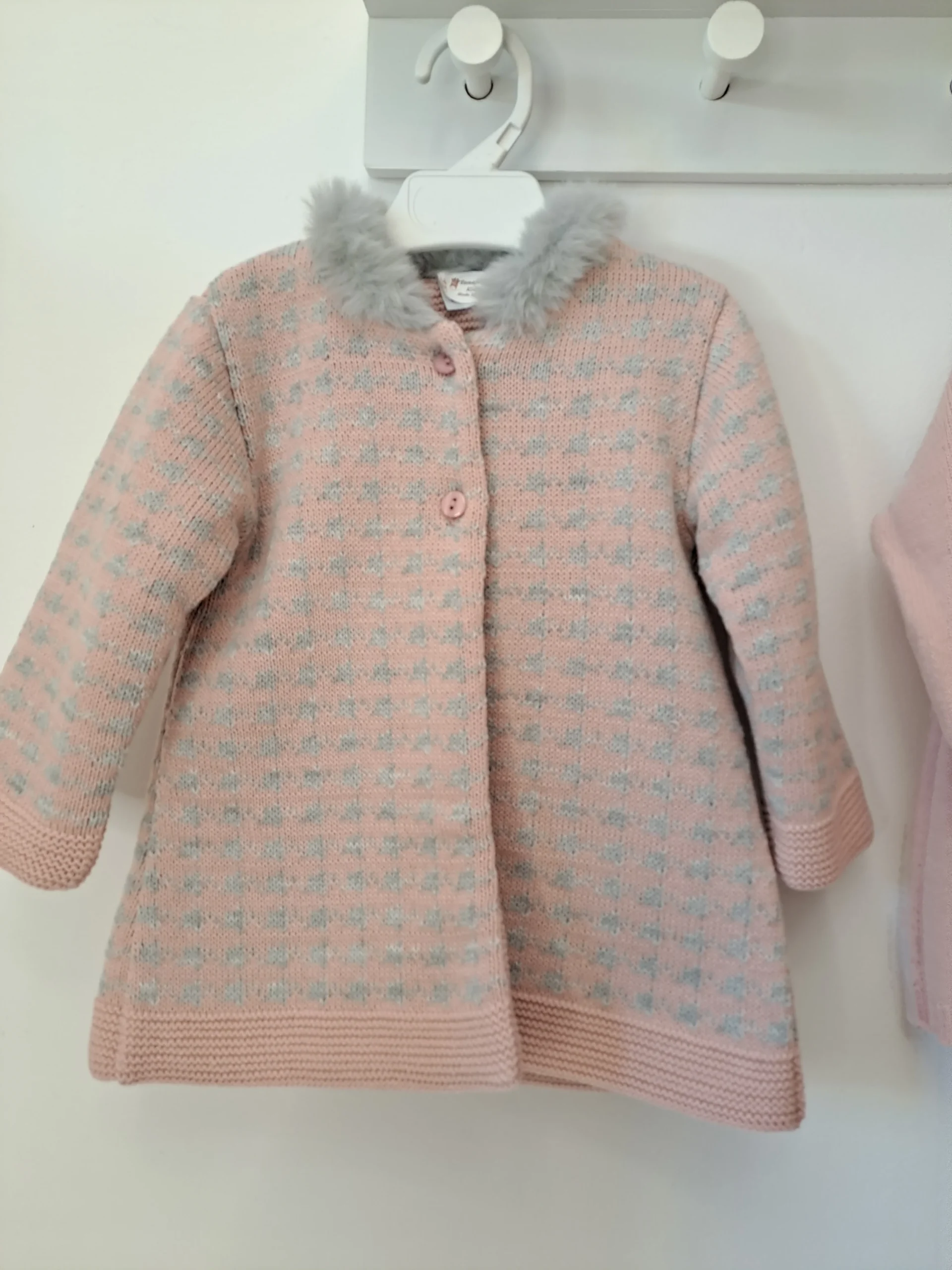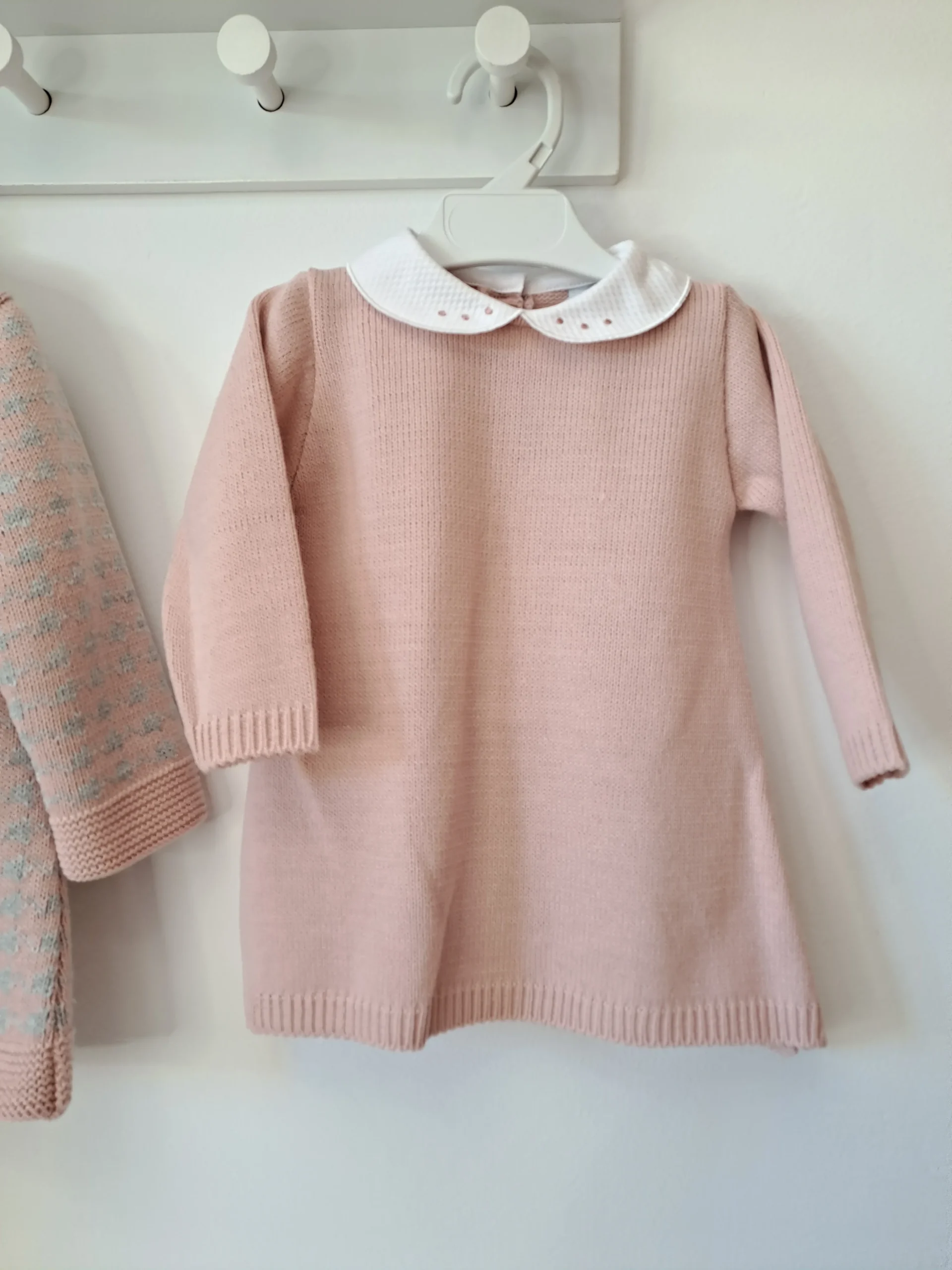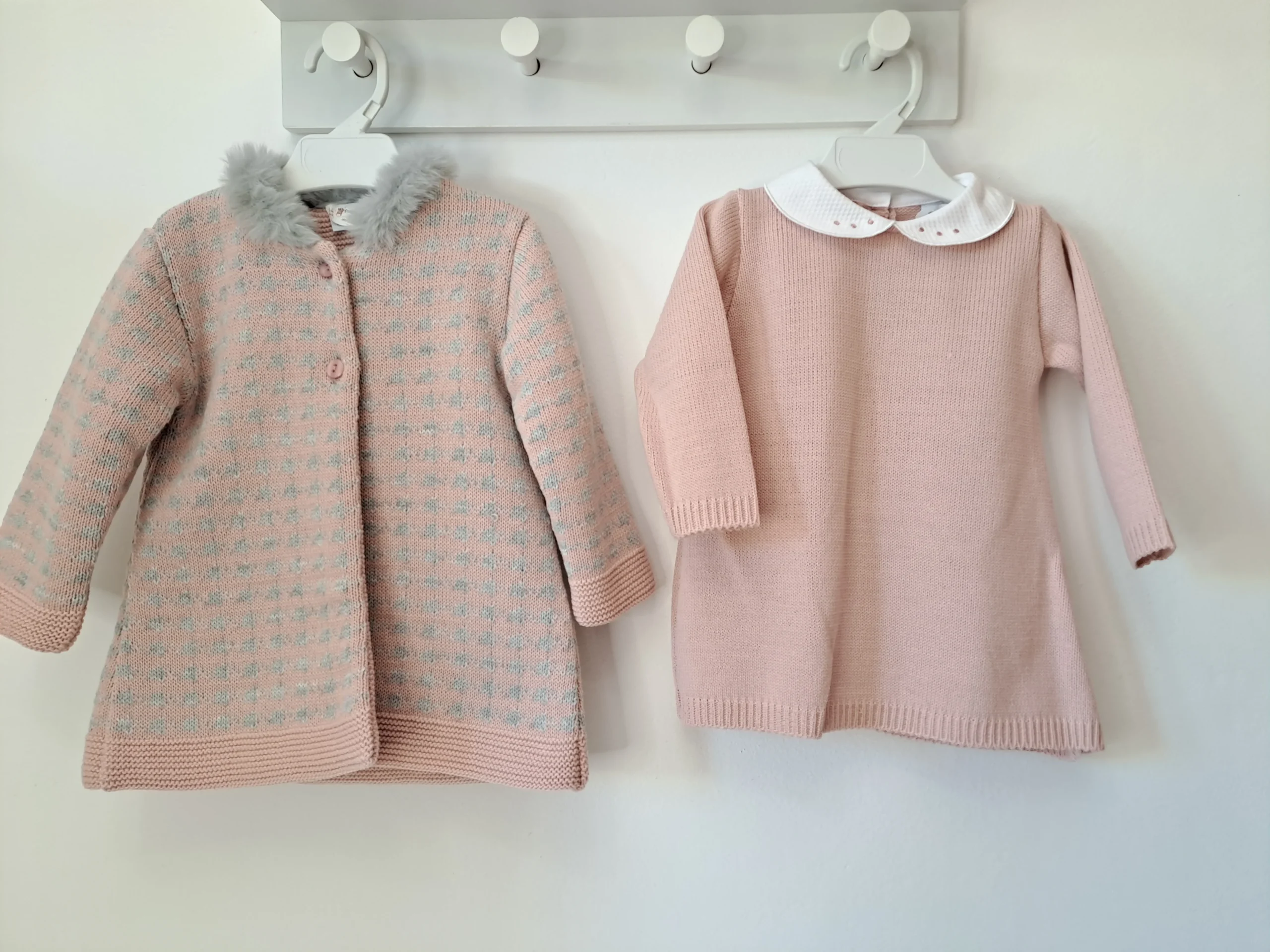 Conjunto vestido de punto con abrigo color maquillaje y filo de pelo con punto de pata de gallo en gris