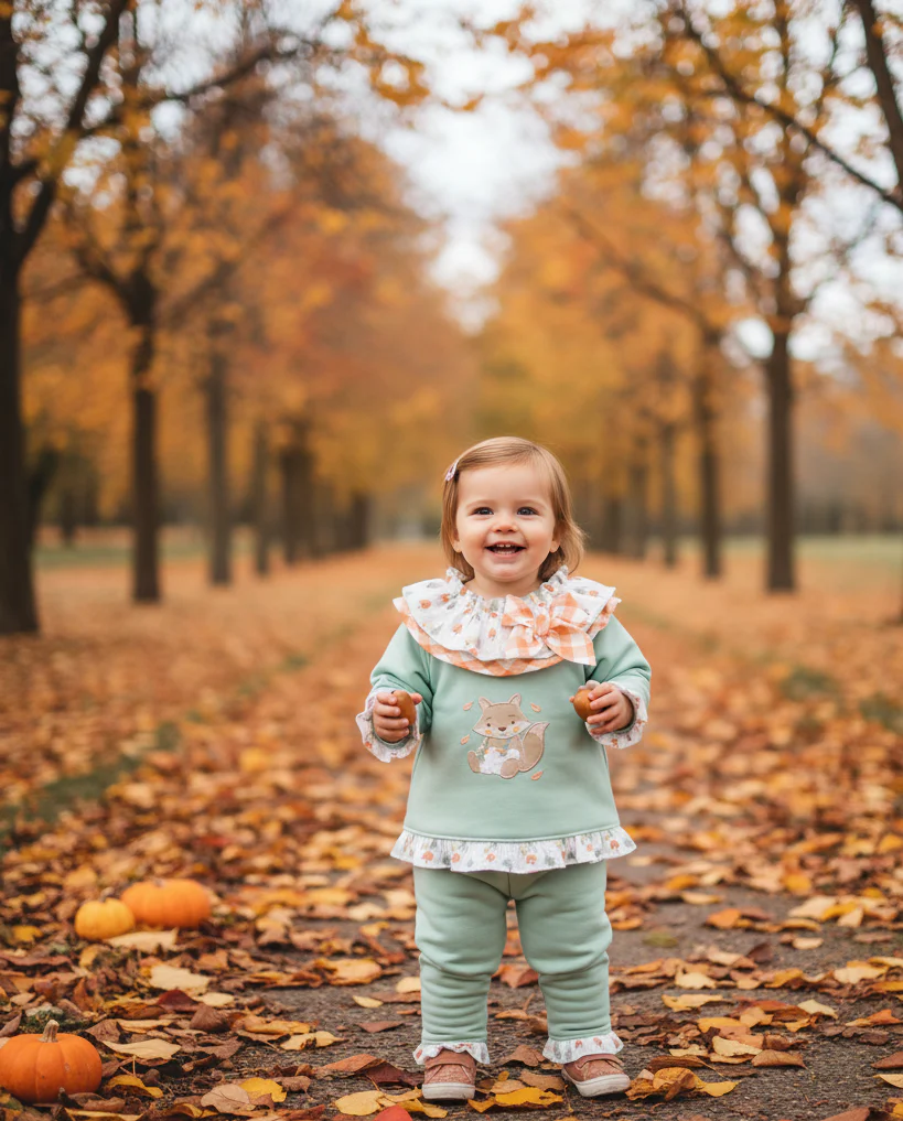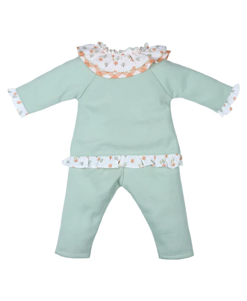Este adorable conjunto para bebé de dos piezas en tono verde palido combina comodidad y elegancia con un toque romántico. La sudadera de manga larga presenta un encantador cuello babero con estampado floral en tonos suaves, adornado con un delicado volante que aporta un aire vintage y femenino. El detalle de volantes en el bajo de la blusa y en los puños añade un toque juguetón y dulce. El pantalón a juego, confeccionado en el mismo tejido suave y elástico, ofrece libertad de movimiento y confort. Cierre trasero con broches a presión para facilitar el cambio. Ideal para ocasiones especiales o para un dÃa lleno de ternura
