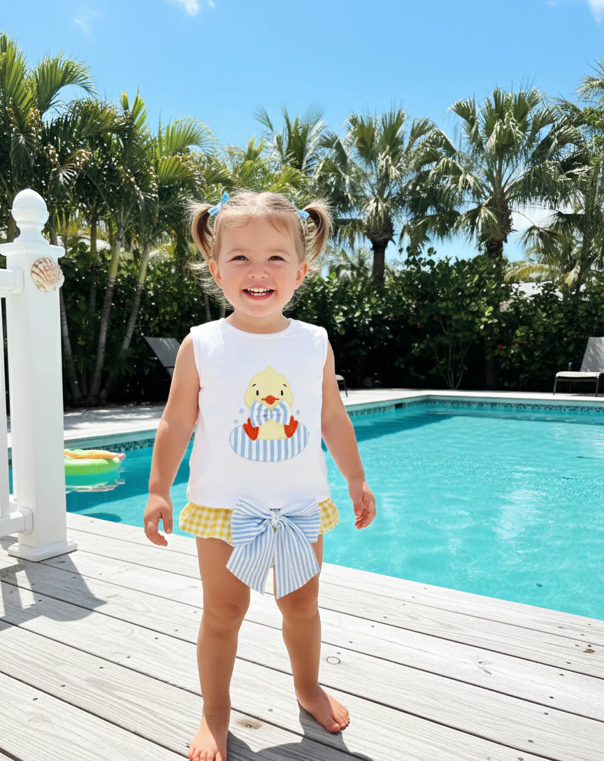Conjunto camiseta algodón y braguita bañador con volante y lacito en el centro 💚