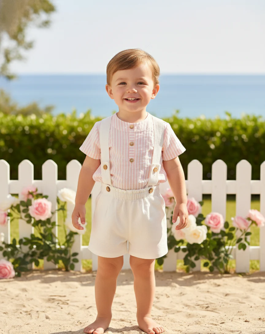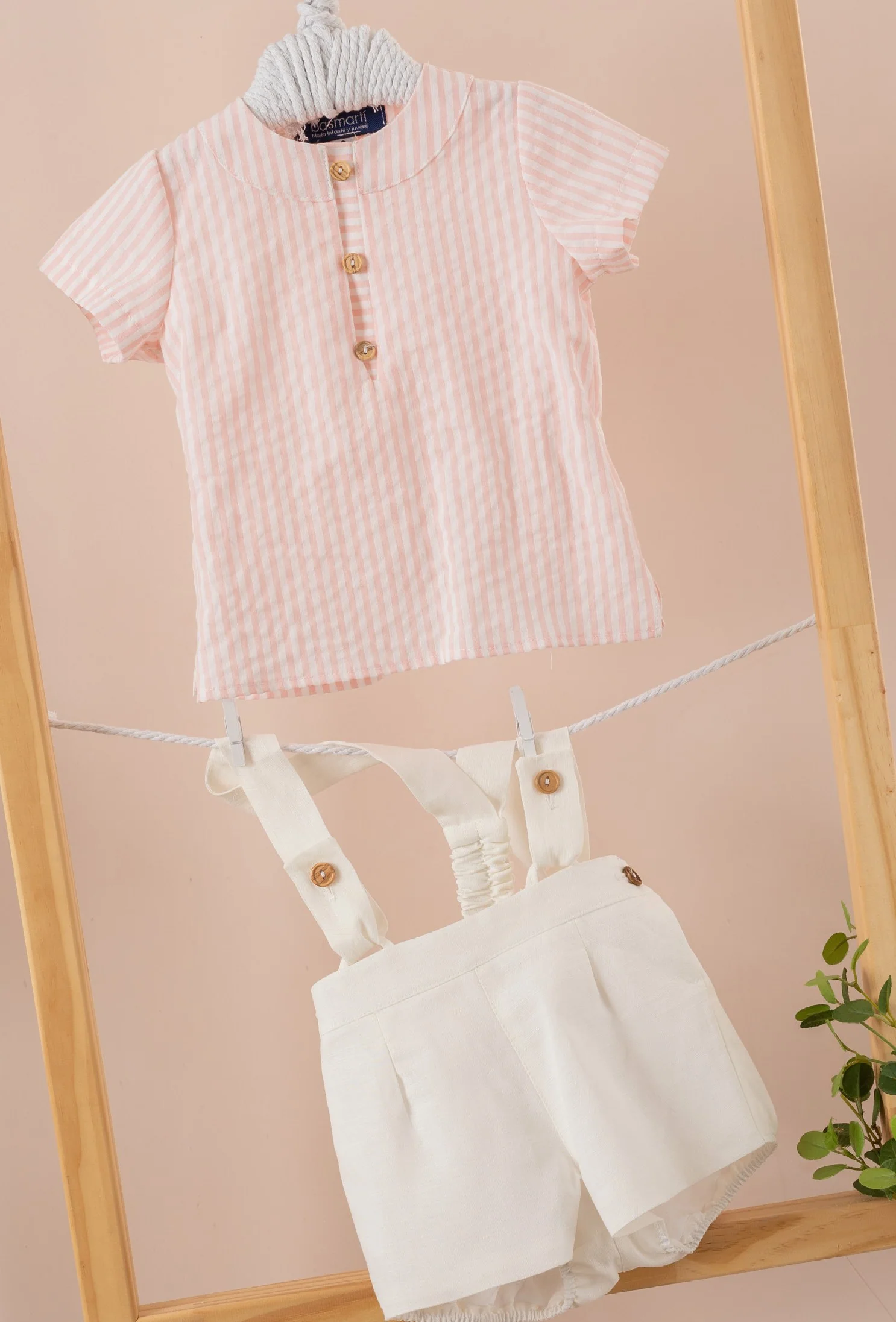 💐 Conjunto crema con camisas rallas pastel hermanos conjuntados, con botón con apertura superior.💐