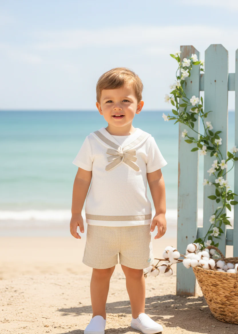 Conjunto de niños camisa lino y pantalón corto de crema y beige, con botón con apertura trasera.