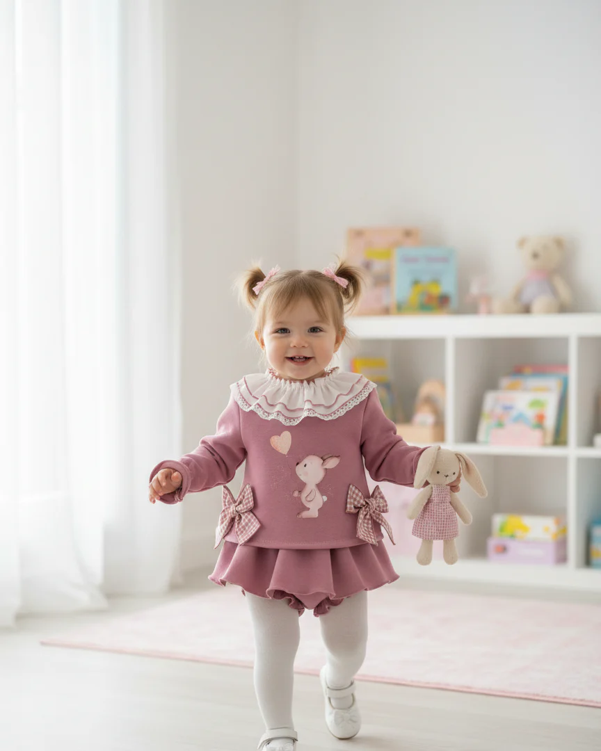 El conjunto infantil de sudadera, camiseta y braguita 3 piezas de algodón color buganvilia con un diseño clásico con estampado de conejito con globo de corazón y volante en el cuerpo con lazo la camiseta blanca con remate en rosa en el filo del volante, confeccionado en un material suave y cálido.