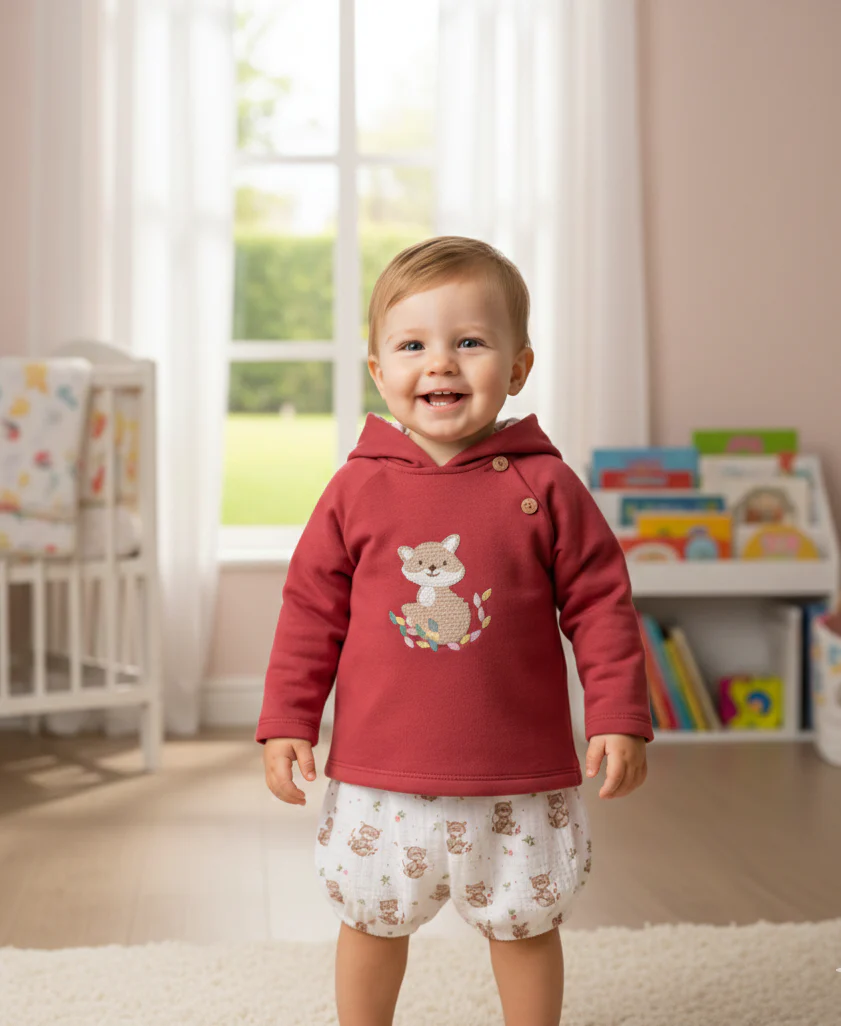 🌿Conjunto infantil compuesto por una sudadera tipo chaqueta en tono terracota con delicado bordado de zorrito y hojas de colores al frente. Tiene capucha bordado pequeño zorro, que le da un toque dulce y elegante. Se complementa con un pololo (braguita) de algodón blanco estampado con minizorritos y detalles florales. Ideal para mantener a tu bebé cómodo y con estilo en cualquier ocasión✨