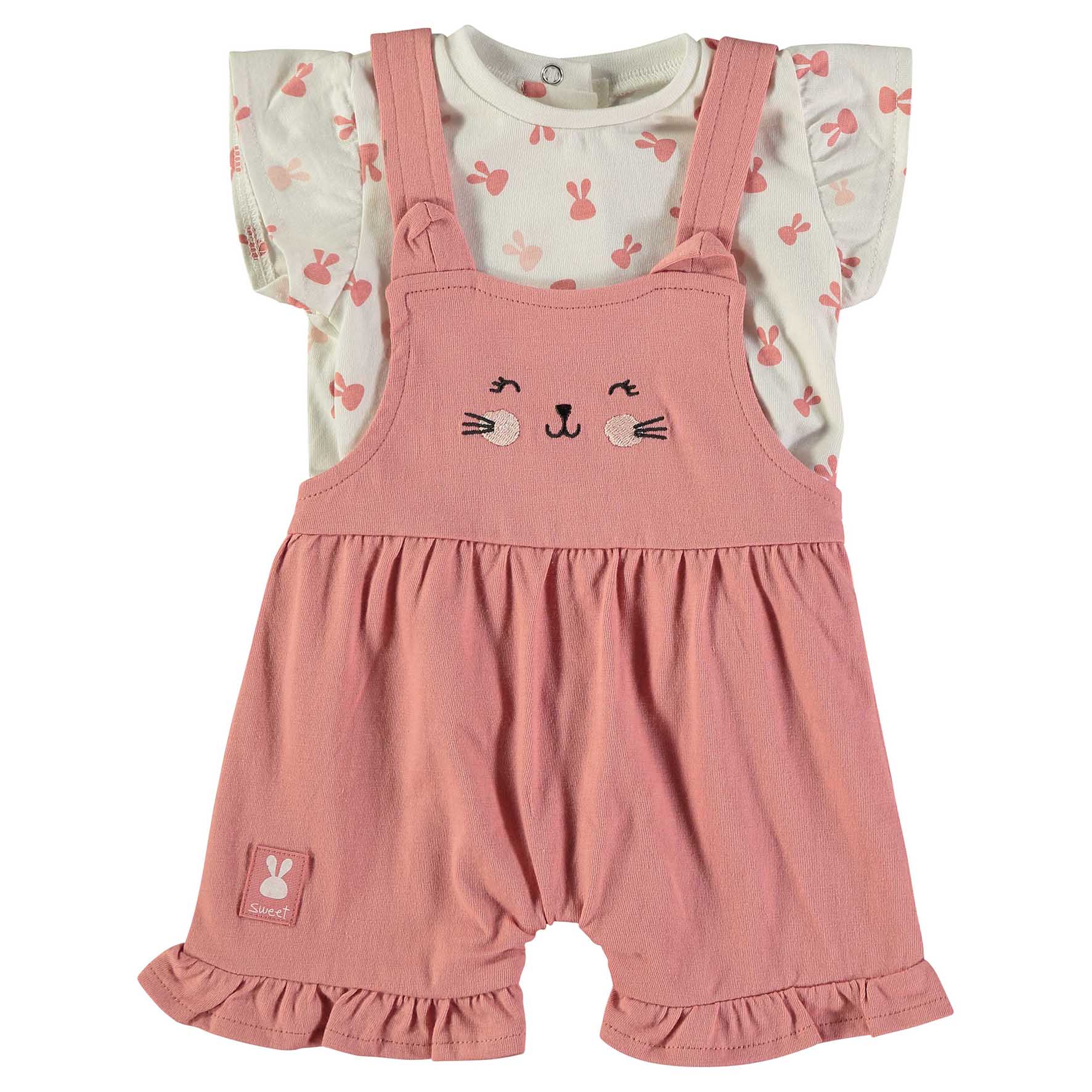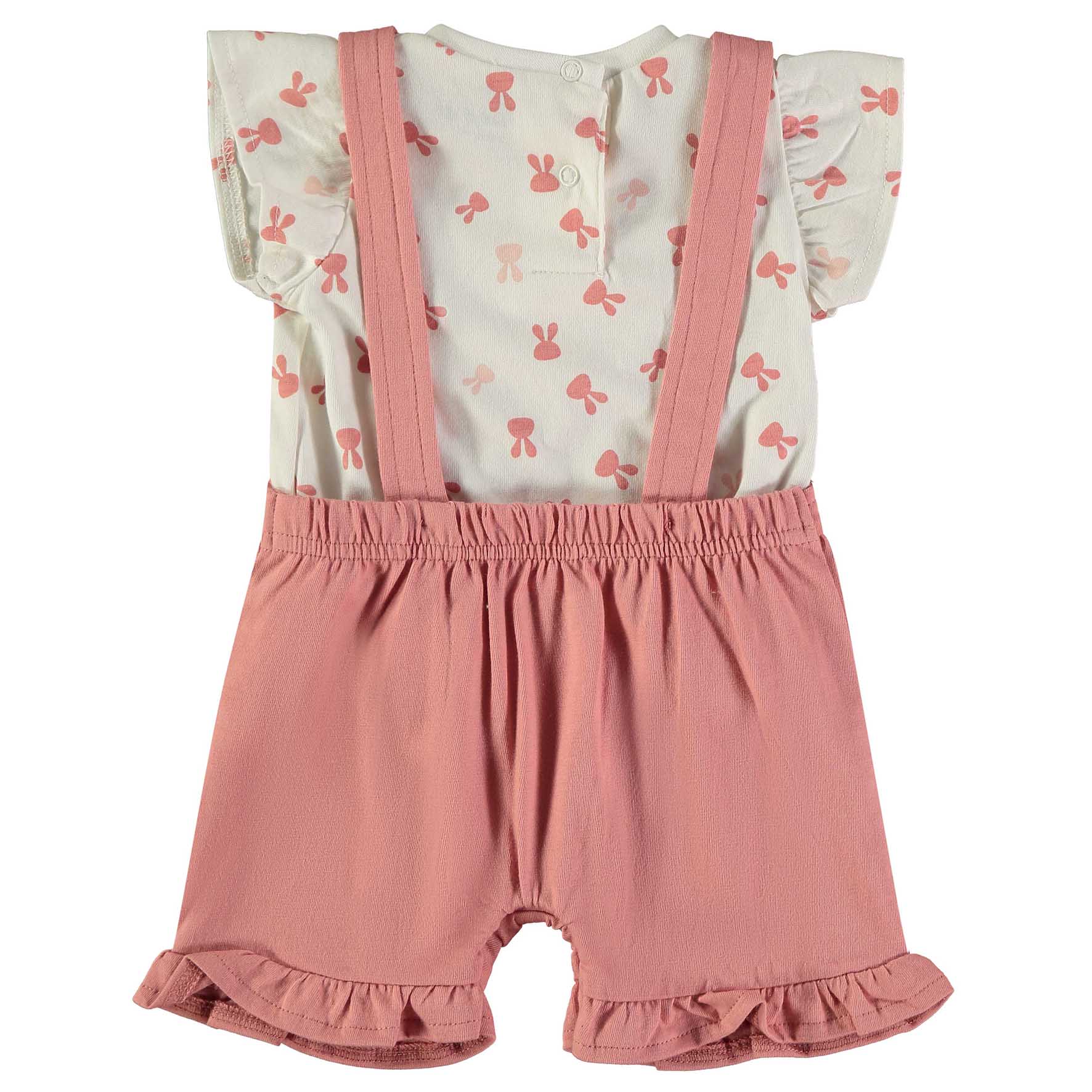 Pieza principal: Se trata de un peto corto en color rosa empolvado (o rosa viejo). La parte superior cuenta con tirantes anchos que se abotonan en el pecho.