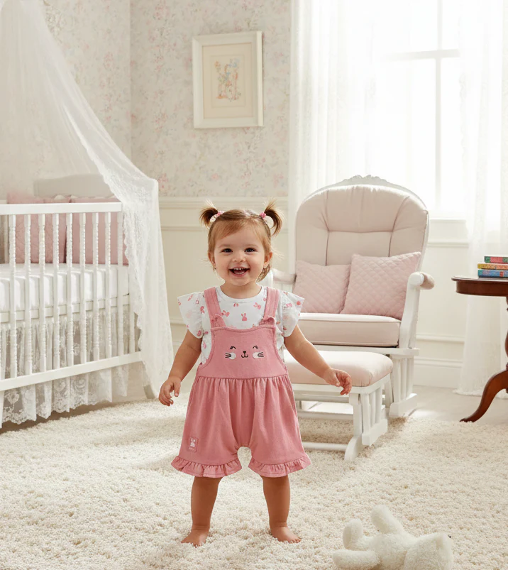 Camiseta/Blusa: El conjunto se suele acompañar de una prenda interior (como se ve en la imagen generada) de color blanco con pequeños motivos estampados que combinan con el rosa del peto.
