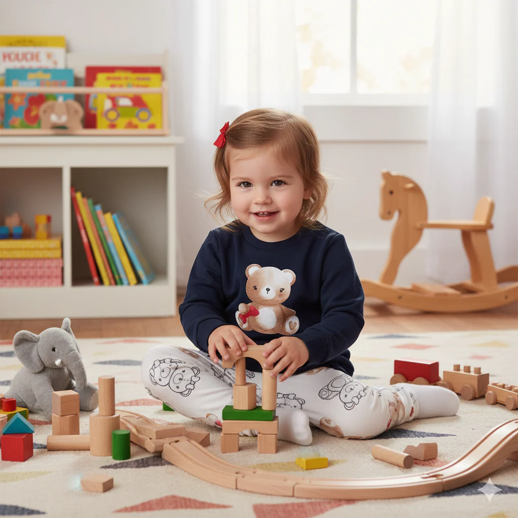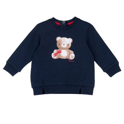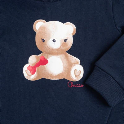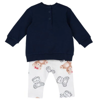 Dulce conjunto para bebé compuesto por sudadera azul marino con estampado de osito y pantalón blanco con divertidos ositos en tonos marrón y negro. Confeccionado en algodón suave, cuenta con prácticos broches en la espalda para facilitar el cambio. Ideal para mantener a tu peque cómodo y con estilo.