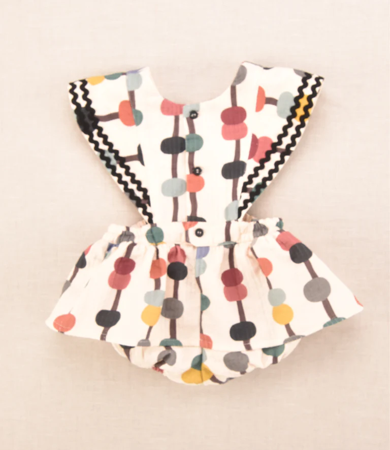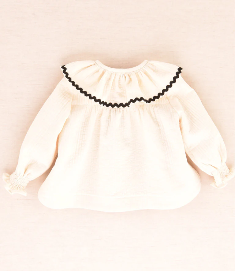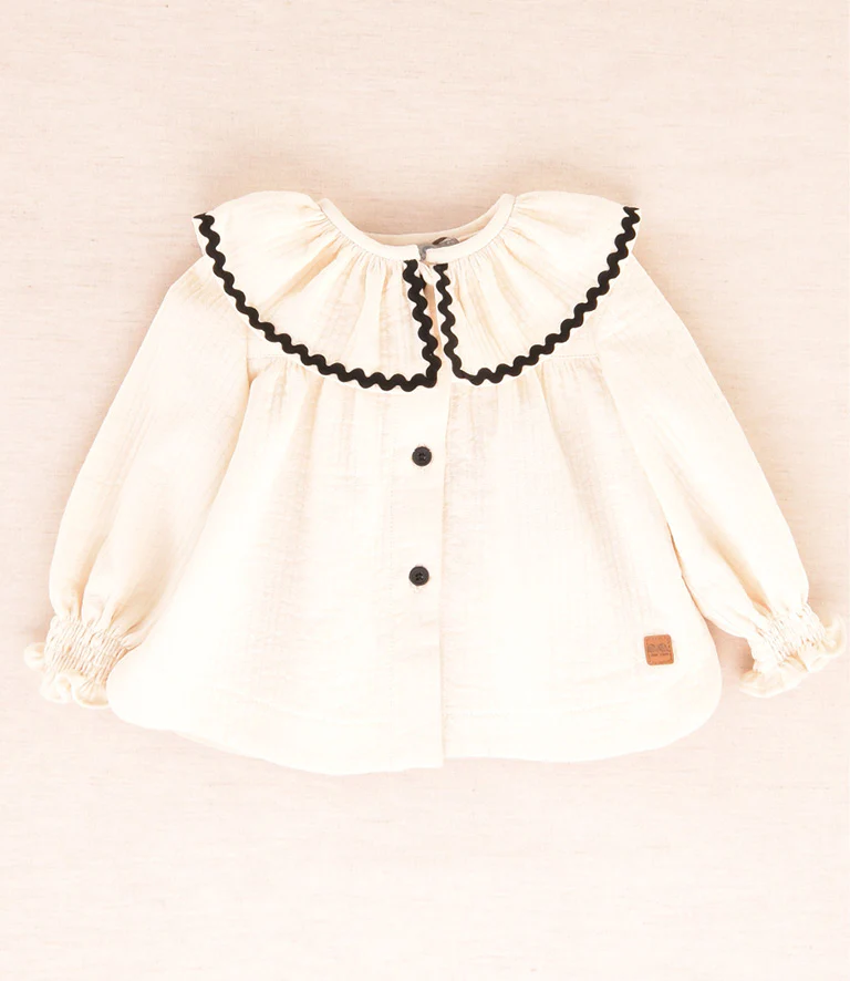 Conjunto de peto con volante camisa de cuello crema con un diseño muy original estampado