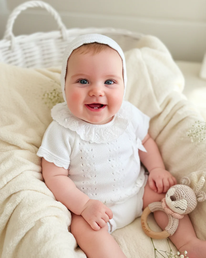 Por ello hemos seleccionado las prendas más delicadas para la piel del recién nacido, realizadas en hilo hipoalergénico.