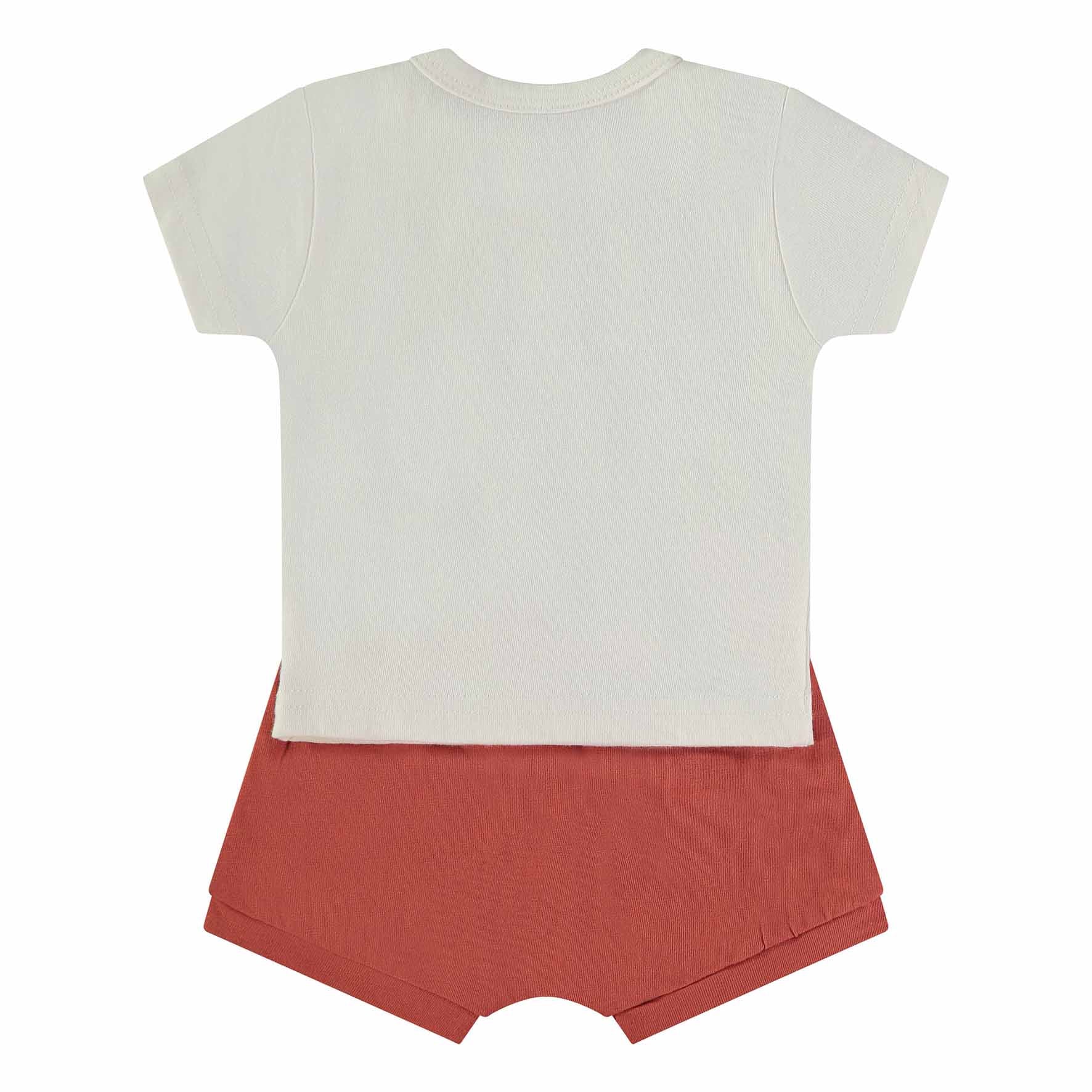 «Aventura en cada paso.» Este conjunto de dos piezas combina una camiseta de algodón suave con un tierno estampado de dinosaurios y unas bermudas en tono terracota vibrante. Diseñado para ofrecer total libertad de movimiento, es la elección perfecta para los pequeños exploradores que no paran de jugar