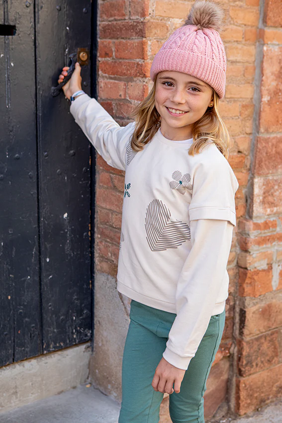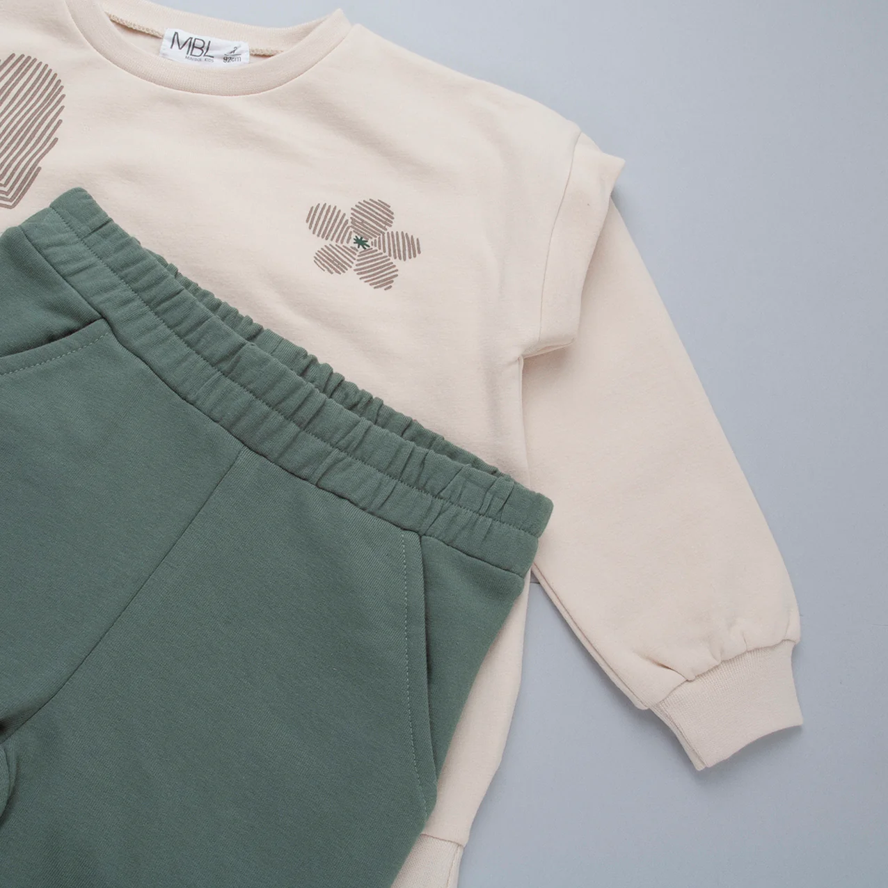 Conjunto de sudadera beige con motivos de corazones y flores y pantalón verde empolvado.