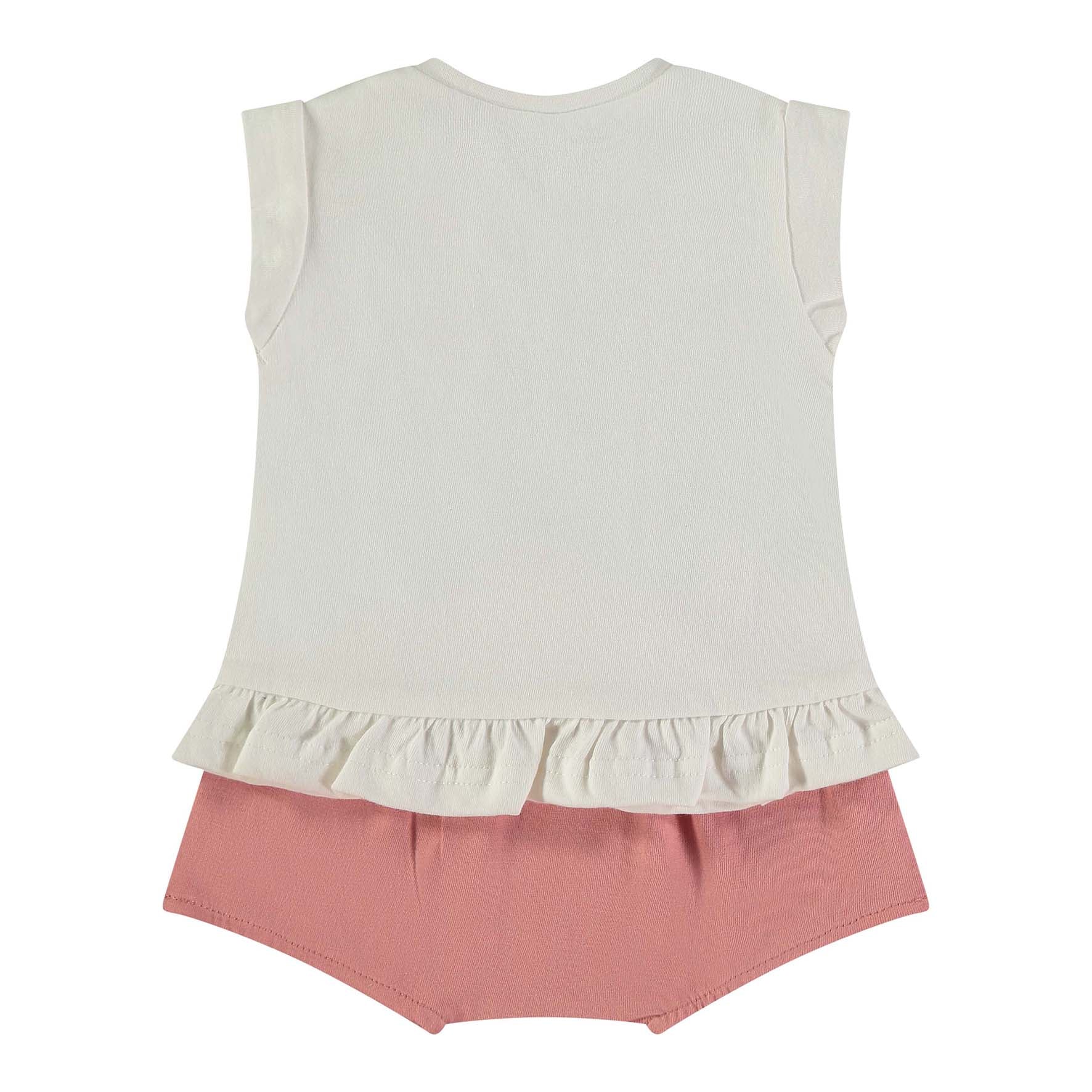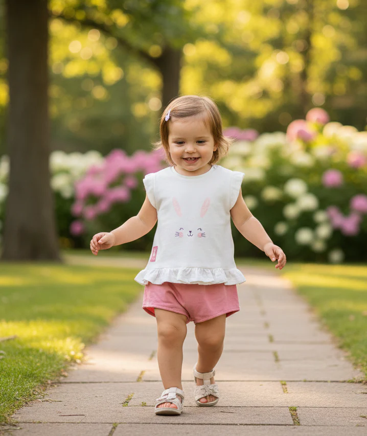 Conjunto «Dulce Conejito» Haz que sus primeros pasos sean inolvidables con este tierno conjunto de dos piezas. La camiseta de algodón blanco destaca por su delicado bordado de conejito y un volante en el bajo que aporta movimiento, mientras que el pantalón rosa suave ofrece la máxima comodidad para un día de juegos en el parque. ¡Pura dulzura para tu pequeña!