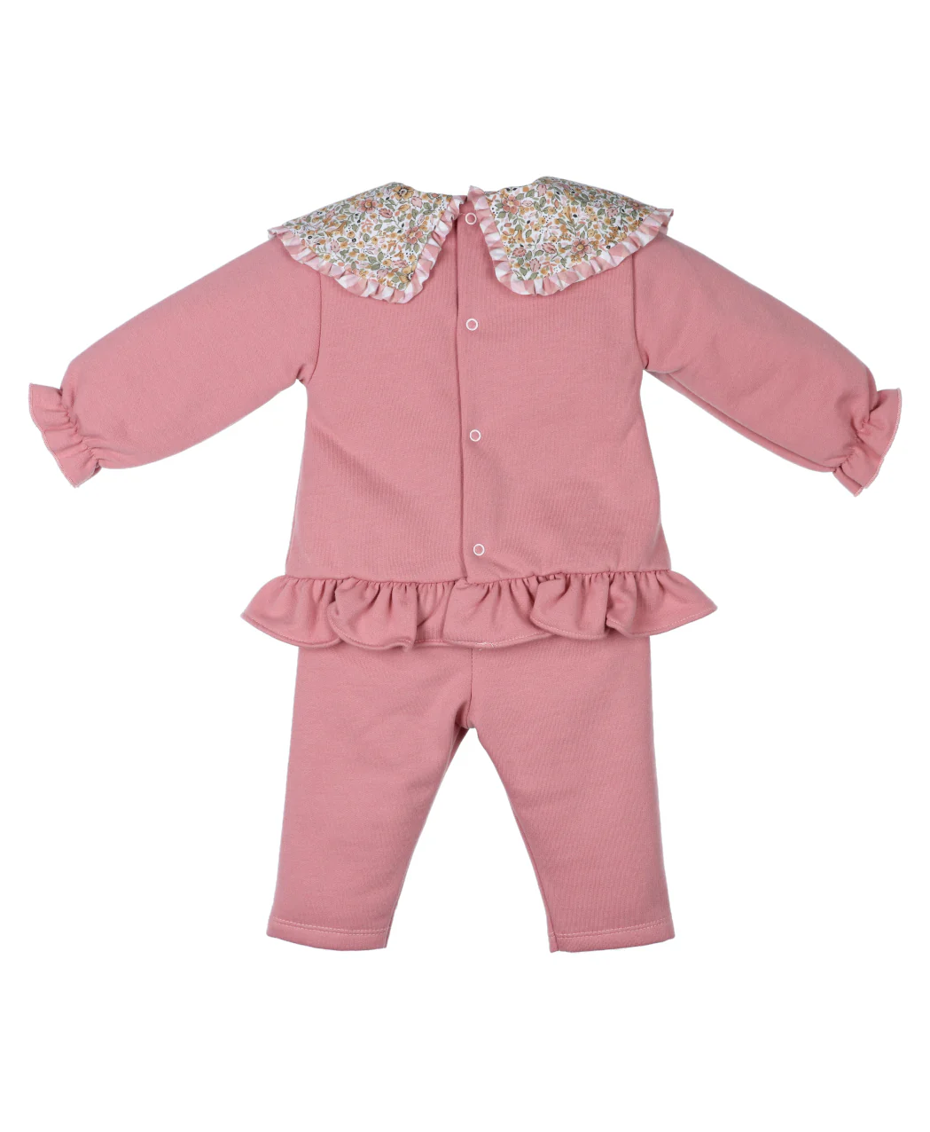 Este adorable conjunto para bebé de dos piezas en tono rosa antiguo combina comodidad y elegancia con un toque romántico. La blusa de manga larga presenta un encantador cuello babero con estampado floral en tonos suaves, adornado con un delicado volante que aporta un aire vintage y femenino. El detalle de volantes en el bajo de la blusa y en los puños añade un toque juguetón y dulce. El pantalón a juego, confeccionado en el mismo tejido suave y elástico, ofrece libertad de movimiento y confort. Cierre trasero con broches a presión para facilitar el cambio. Ideal para ocasiones especiales o para un día lleno de ternura