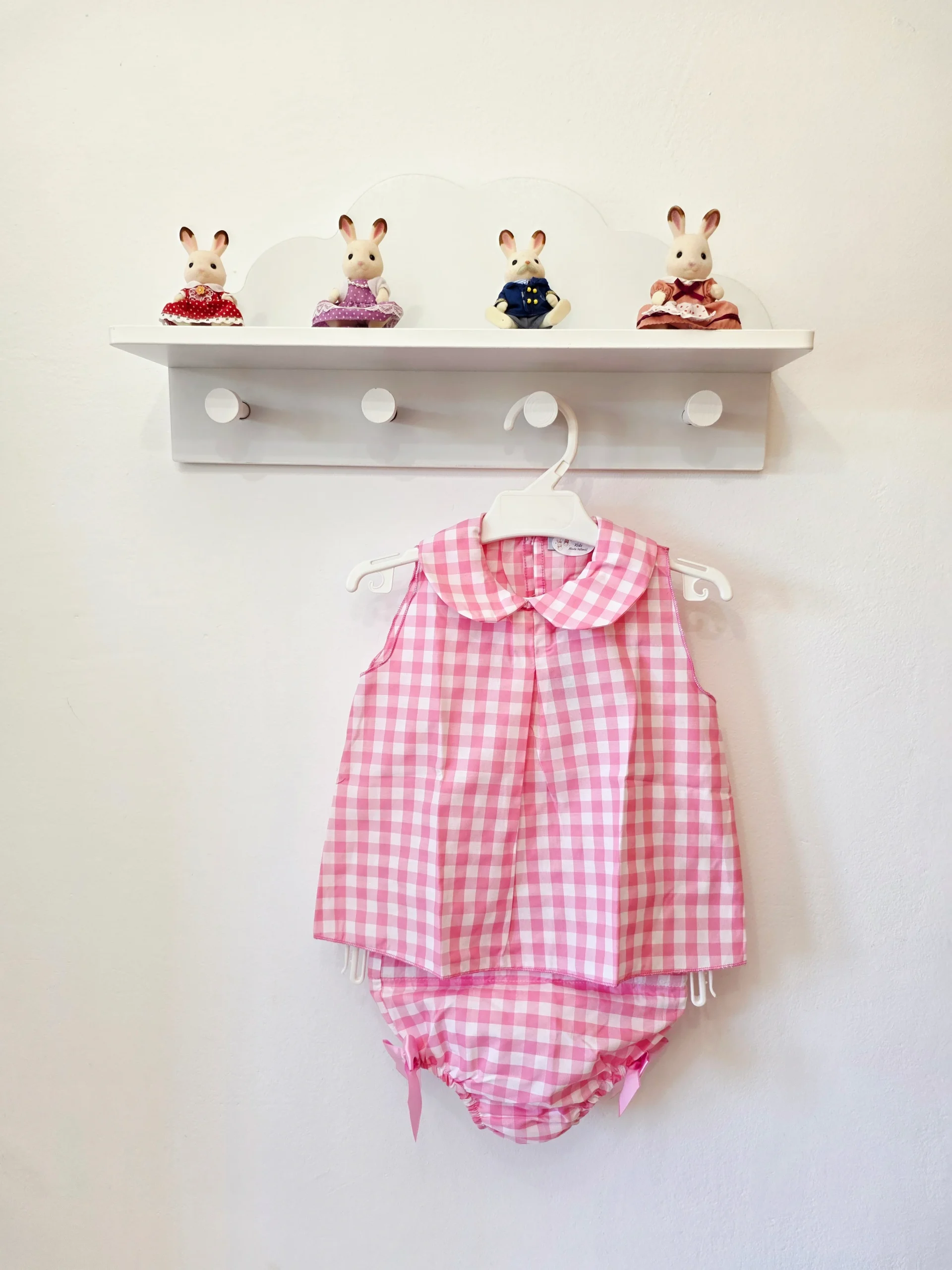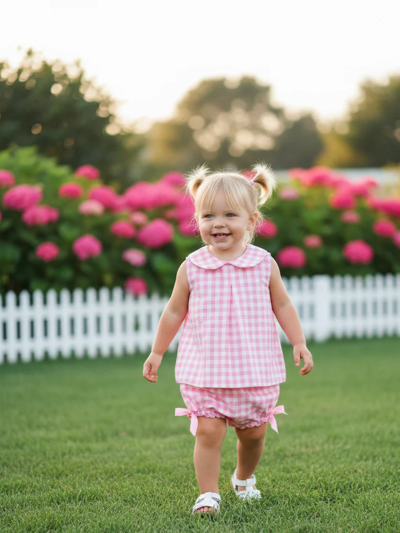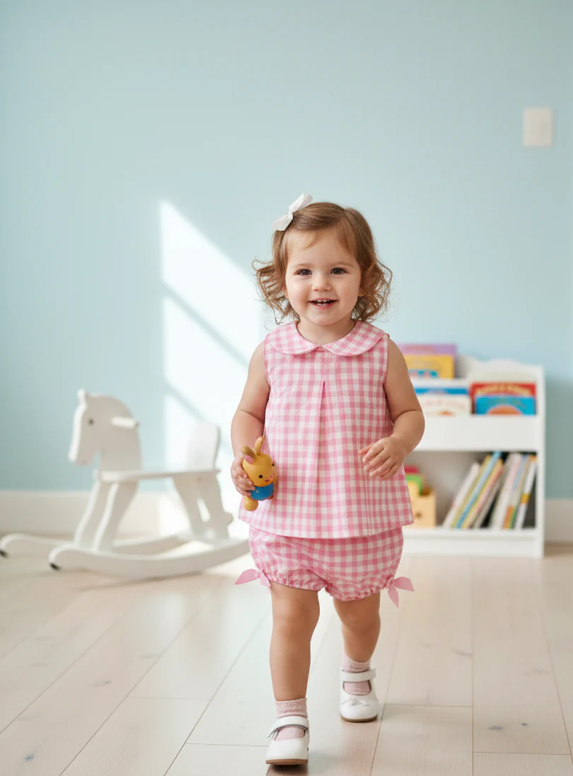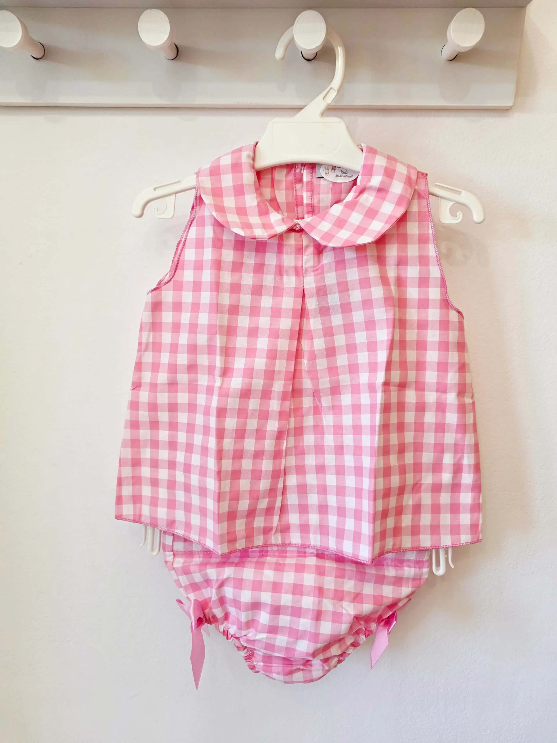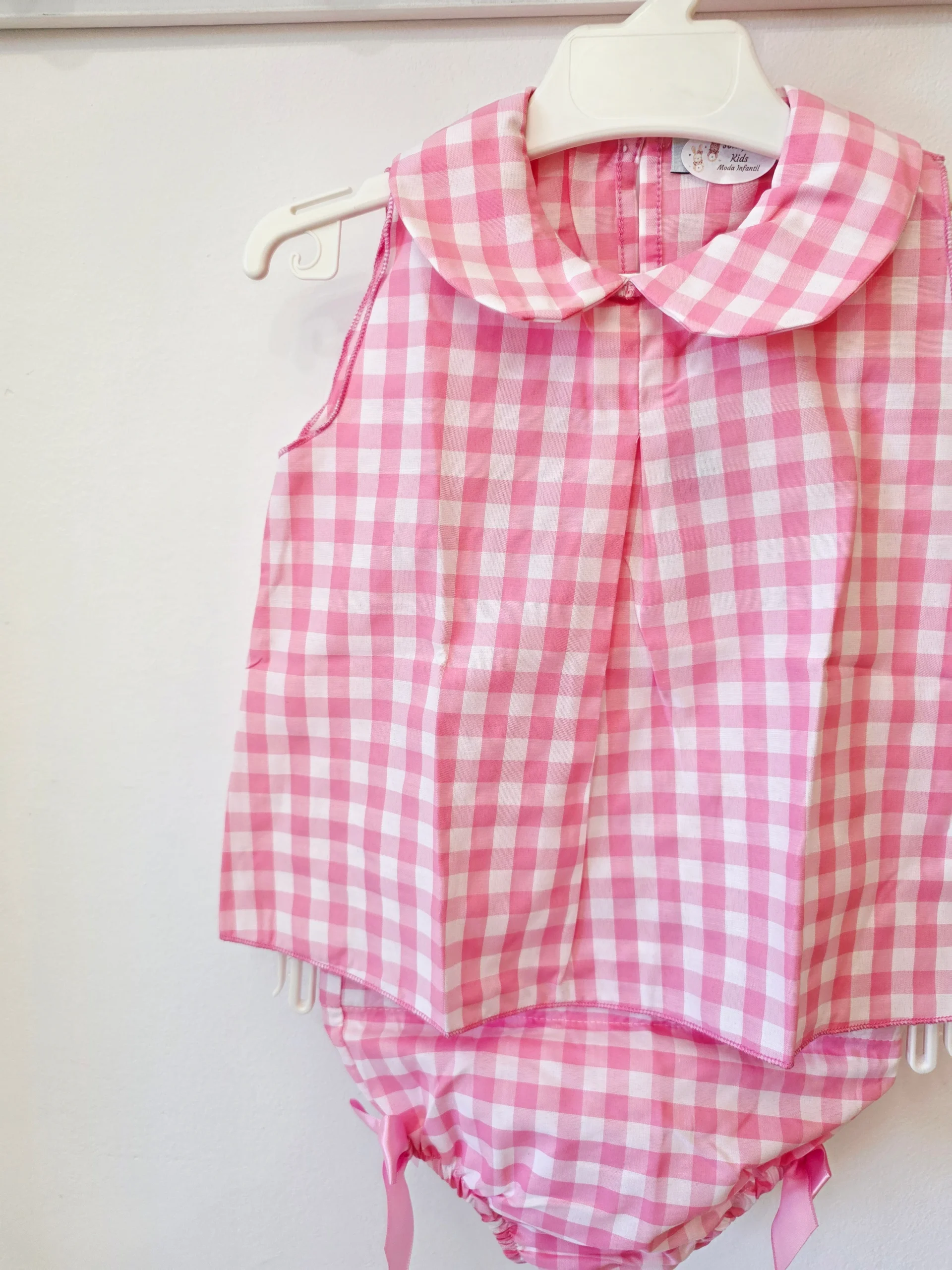Este encantador conjunto de dos piezas destaca por su clásico estampado de cuadros vichy en tono rosa pastel. Se compone de: