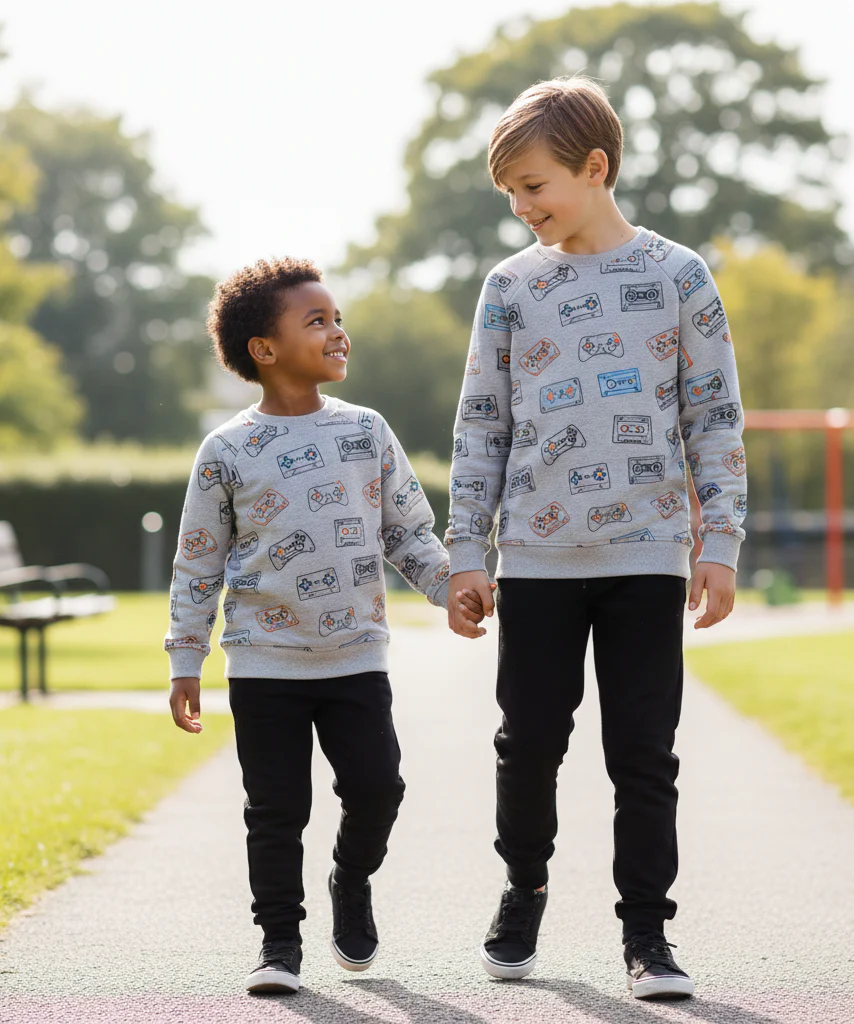 Conjunto para niño en color gris vigoré y negro. Este divertido conjunto consta de una sudadera de manga larga con un estampado de mandos de videojuegos en tonos vibrantes de amarillo y azul, acompañado de un pantalón negro. Confeccionado en un tejido suave y ligero, este conjunto ofrece comodidad y estilo, perfecto para el uso diario. La sudadera en color gris vigoré la convierte en una prenda fácil de combinar con cualquier tipo de pantalón, mientras que el pantalón negro añade un toque moderno y versátil. Ideal para los pequeños aficionados a los videojuegos, este conjunto es una excelente adición al guardarropa de cualquier niño, permitiéndole lucir con estilo y expresar su personalidad. Disponible en tallas para niños de 2 a 16 años, este conjunto es una opción práctica y moderna para cualquier ocasión. ¡Deja que tu pequeño luzca a la moda mientras disfruta de sus juegos favoritos con este conjunto increíble!