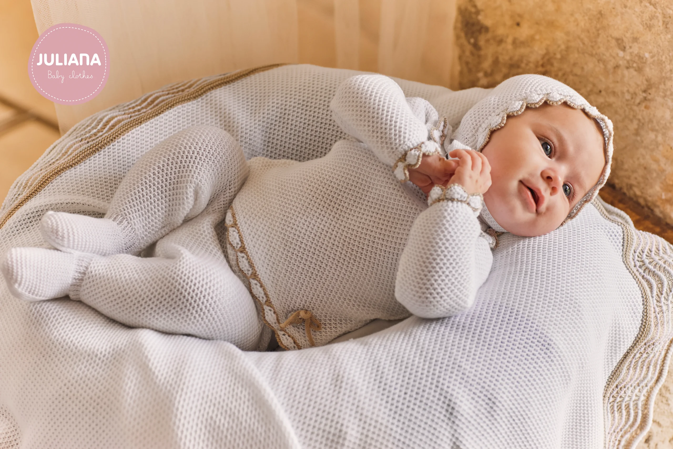 Textura: Punto fino y delicado, probablemente de una mezcla de 50 % algodón o 50% hilo hipoalergénica, pensada para la piel sensible de los recién nacidos.
