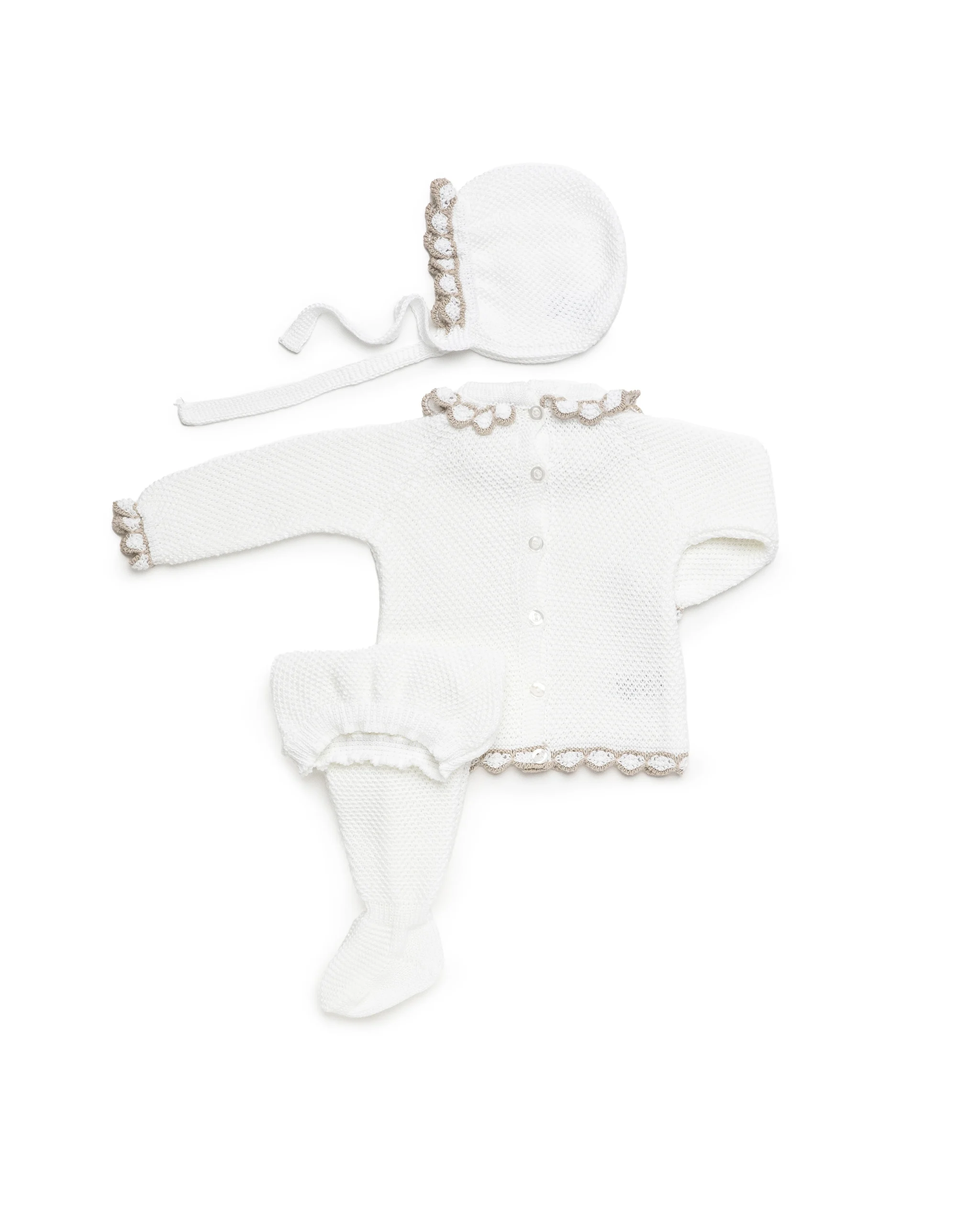 Polainas (Pantalón con pies): A juego con el jersey, confeccionadas en el mismo punto suave para mantener calientes las piernas y los pies del bebé sin necesidad de calcetines adicionales.