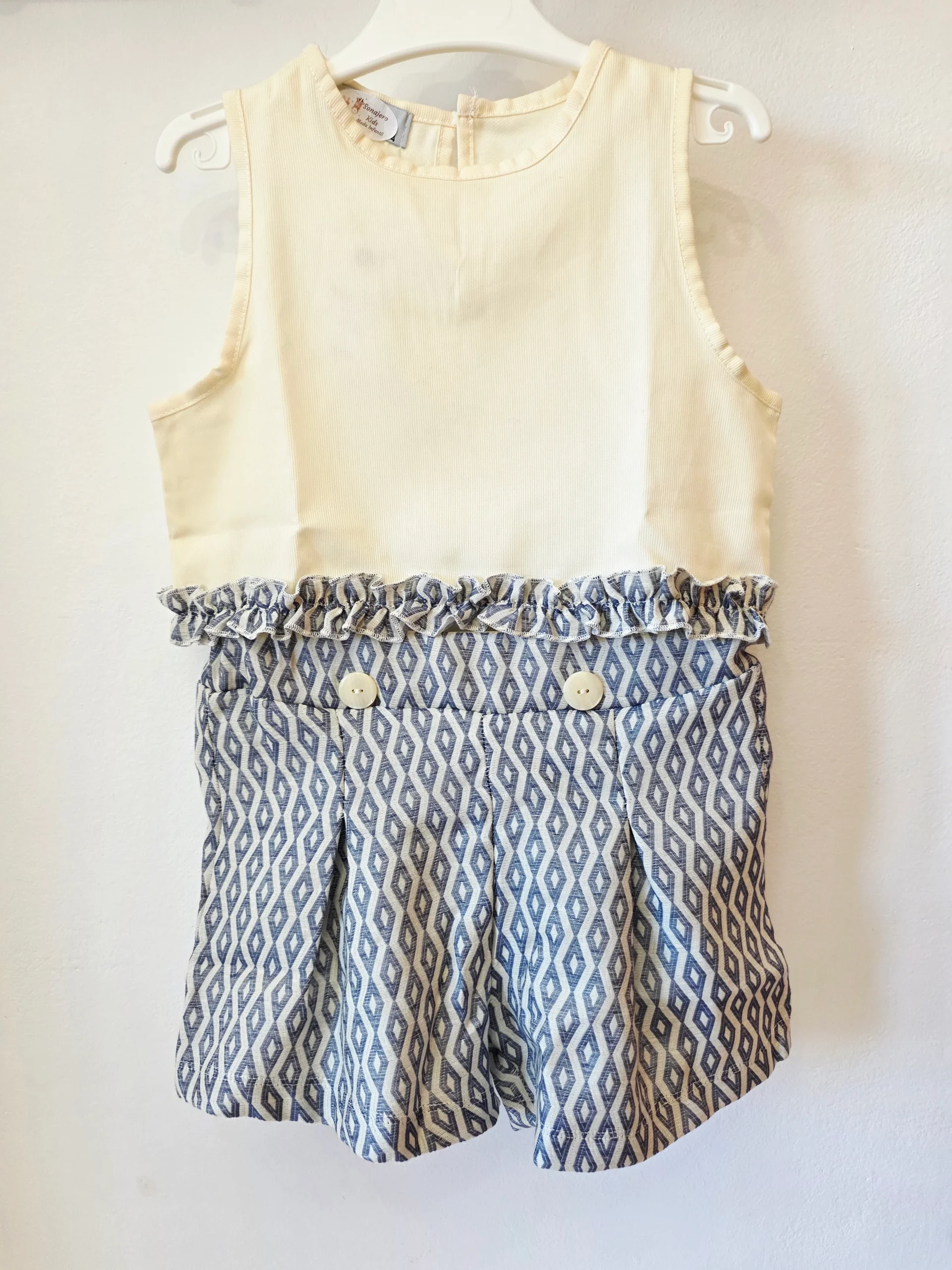 Geométrico Índigo: Resalta el patrón de los pantalones y el tono de azul.
