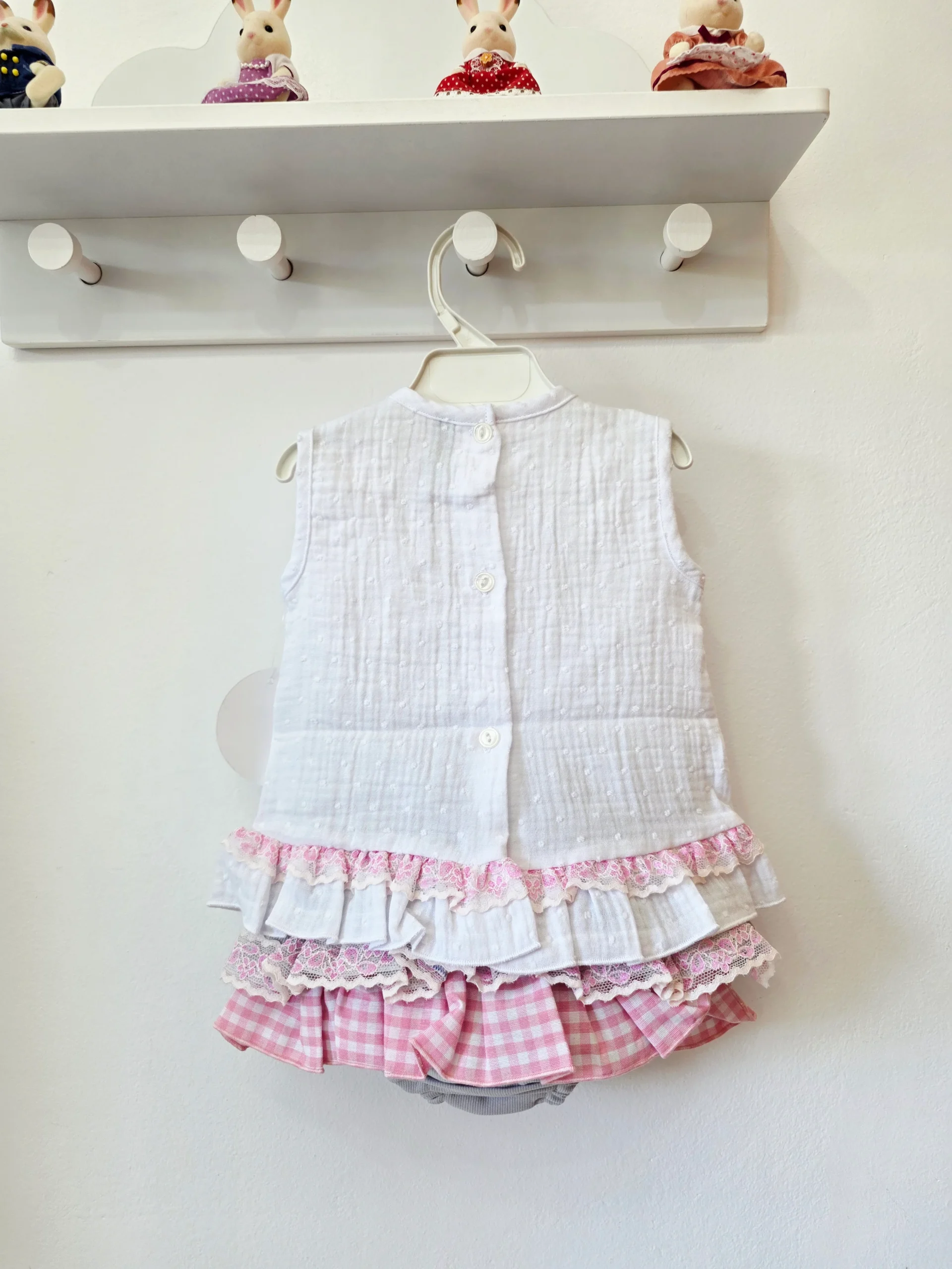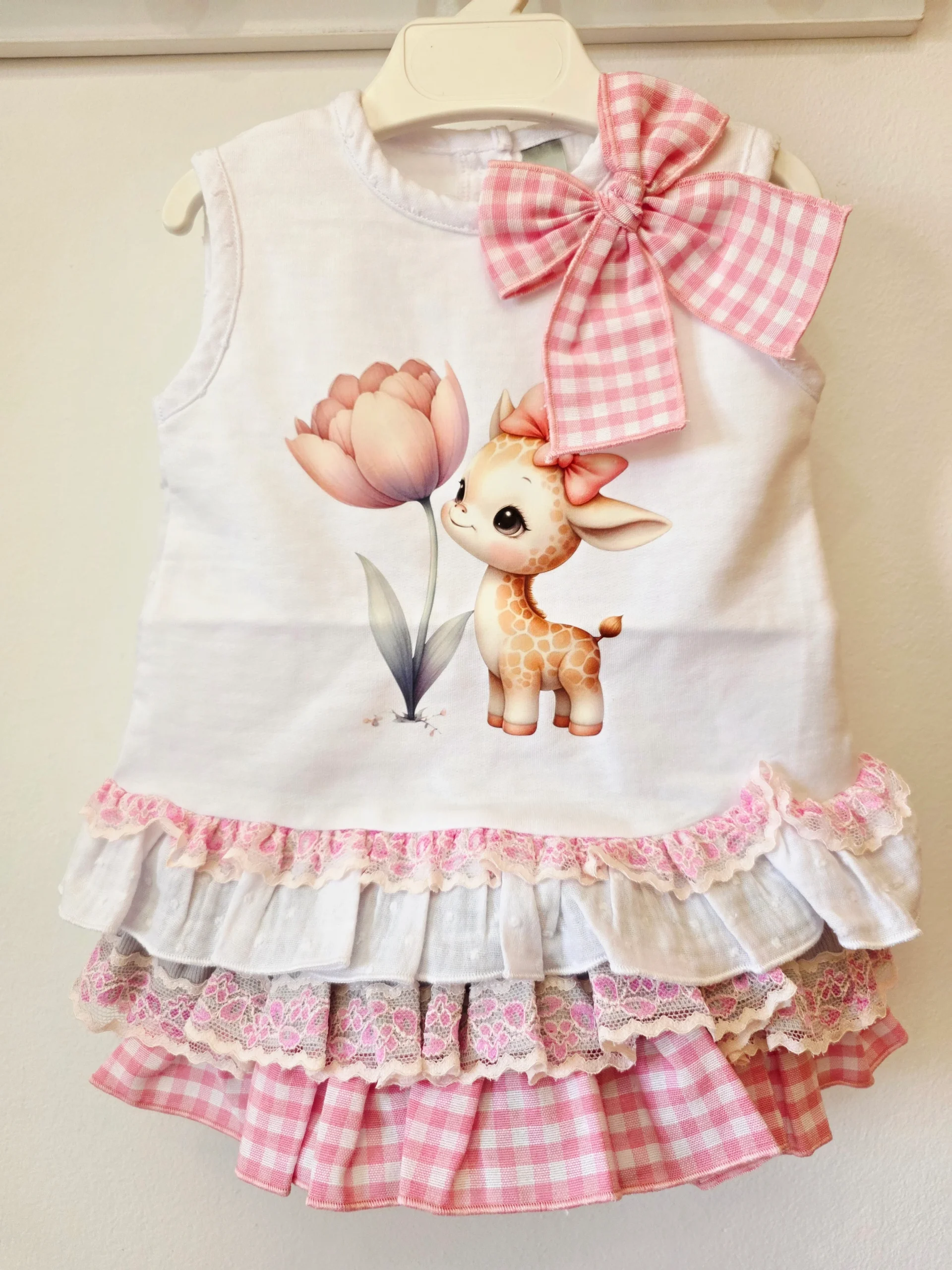 Conjunto de camiseta Blanca y Braguita amarillo vichy con lazo.