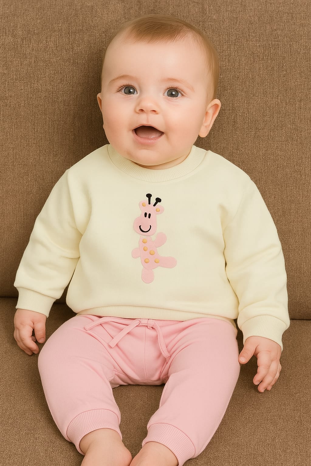 Conjunto de bebé de dos piezas en color rosa y crema con detalle de una jirafita en el frente. Pantalón a juego, cómodo y suave al tacto. Ideal para el día a día con estilo y ternura.