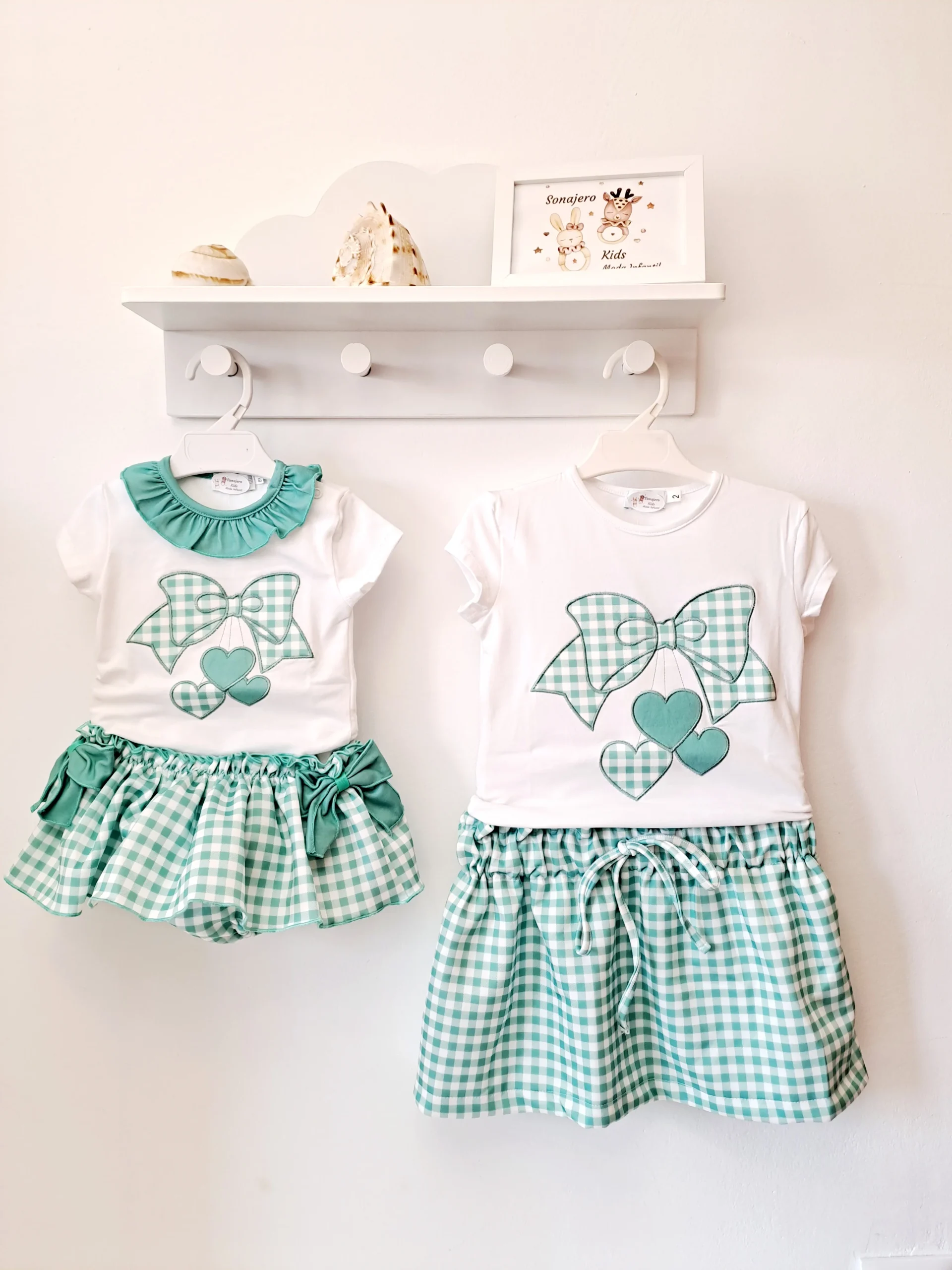 💚Conjunto camiseta y falda verde con temática de lazo y corazones💚